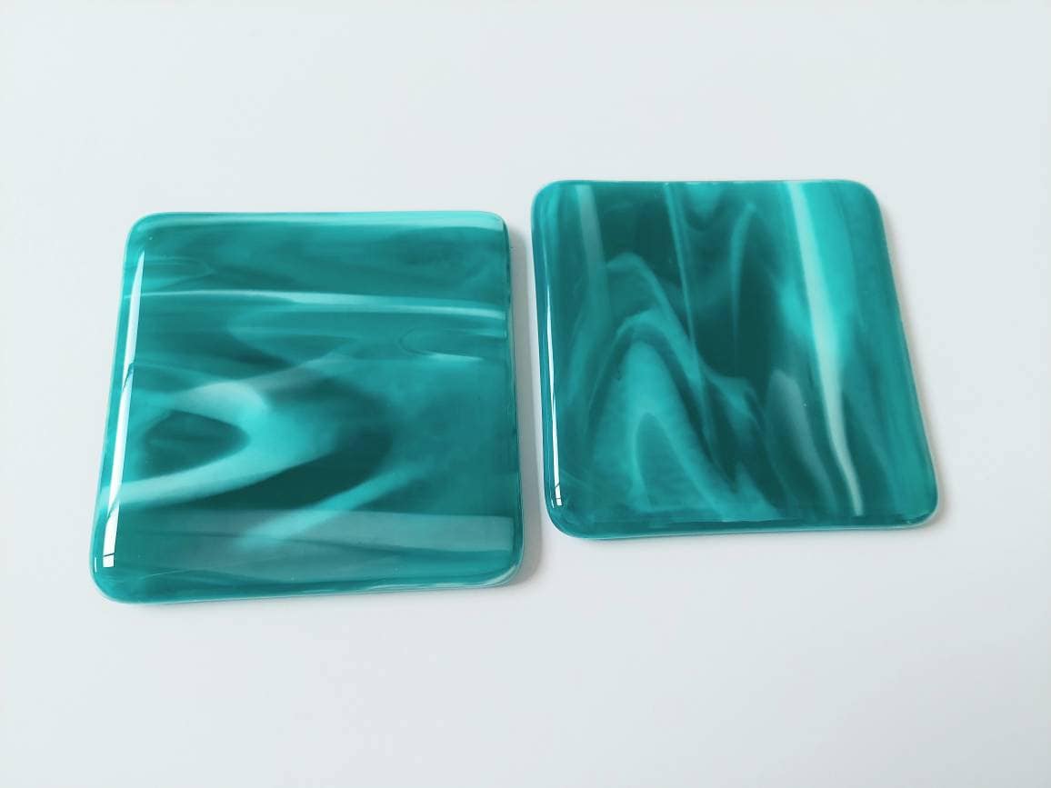 Handmade kiln formed glass art coasters.