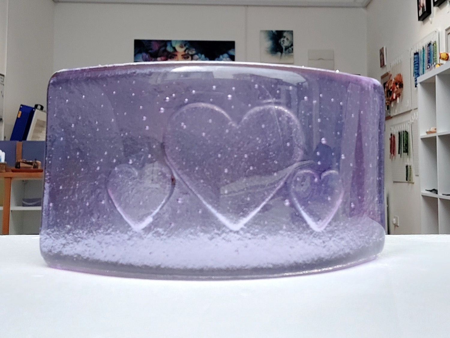 Lilac Glass Heart Ornament, Handmade Light Purple Fused Glass Curve with a Trio of Kiln Carved Hearts