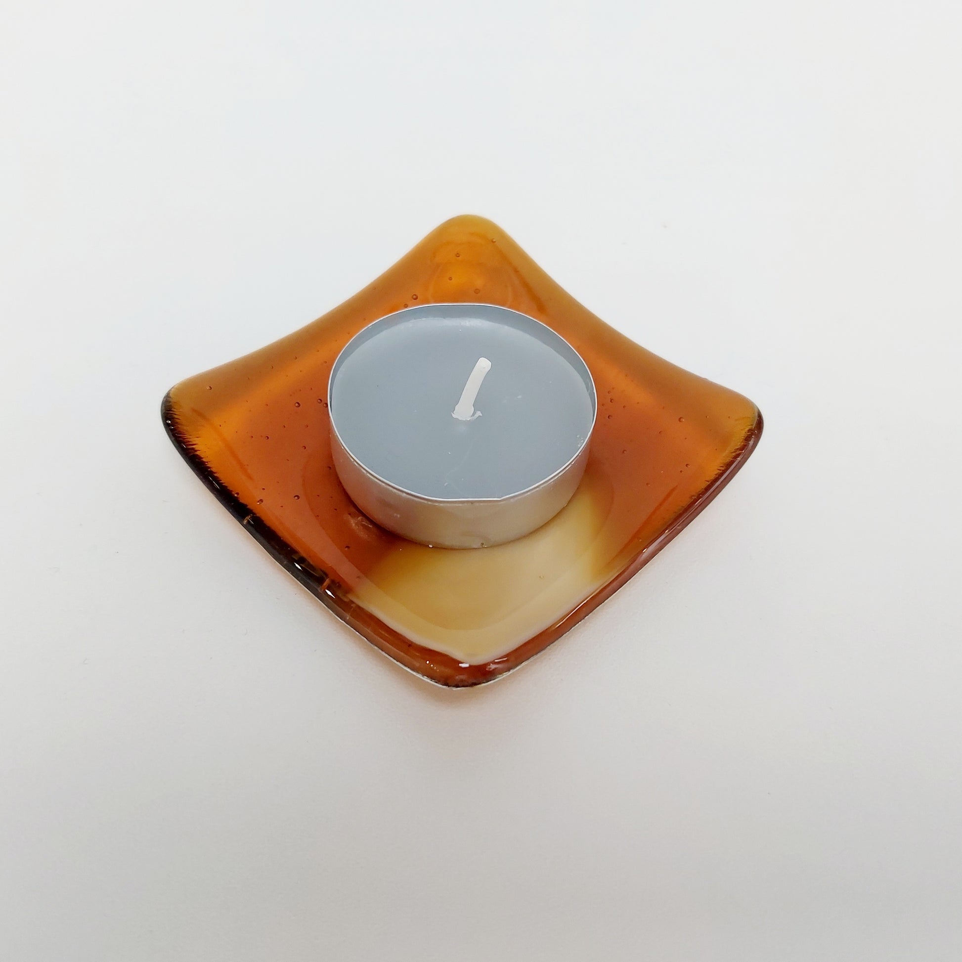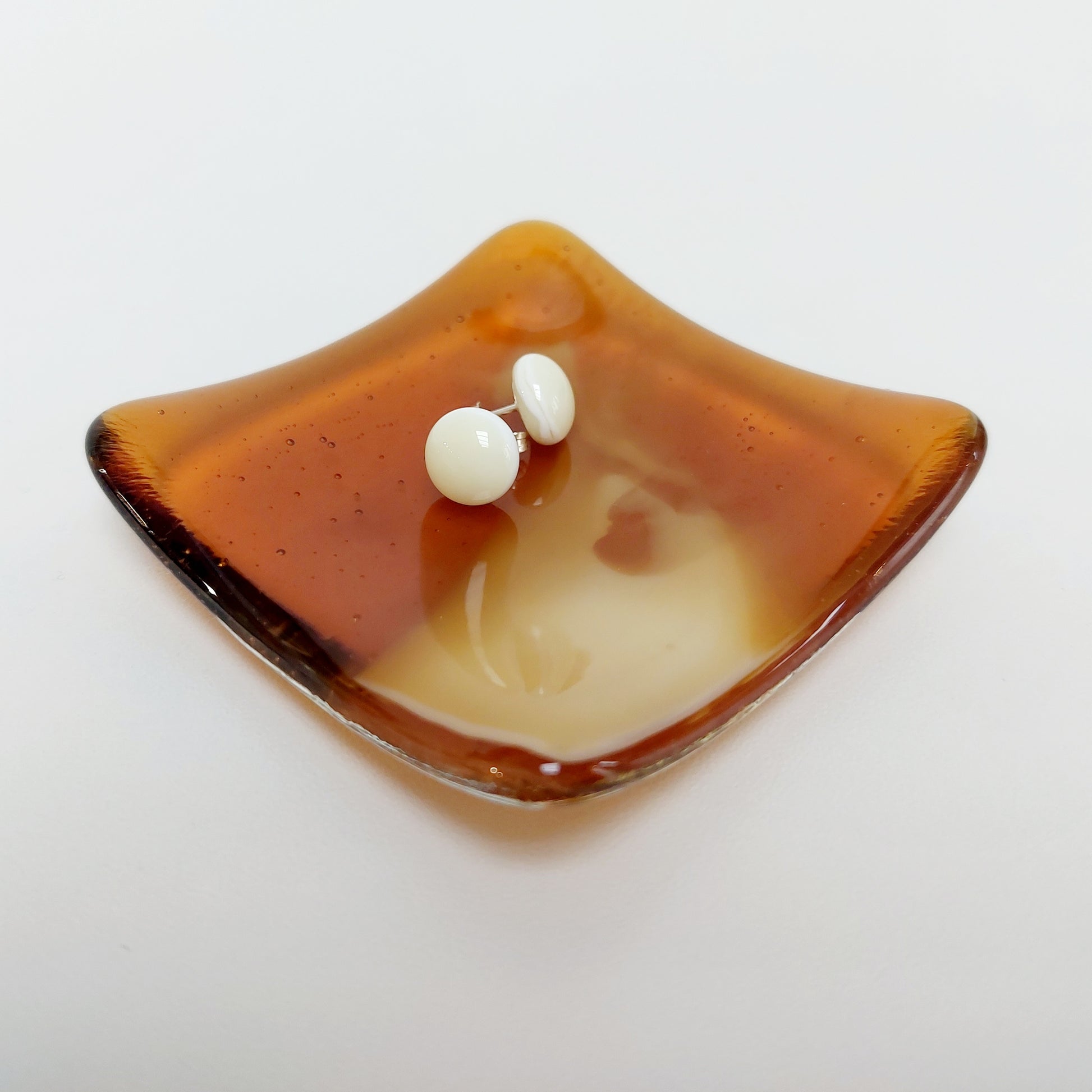 The small glass dish was handmade from transparent amber and opalescent French vanilla artisan glass.