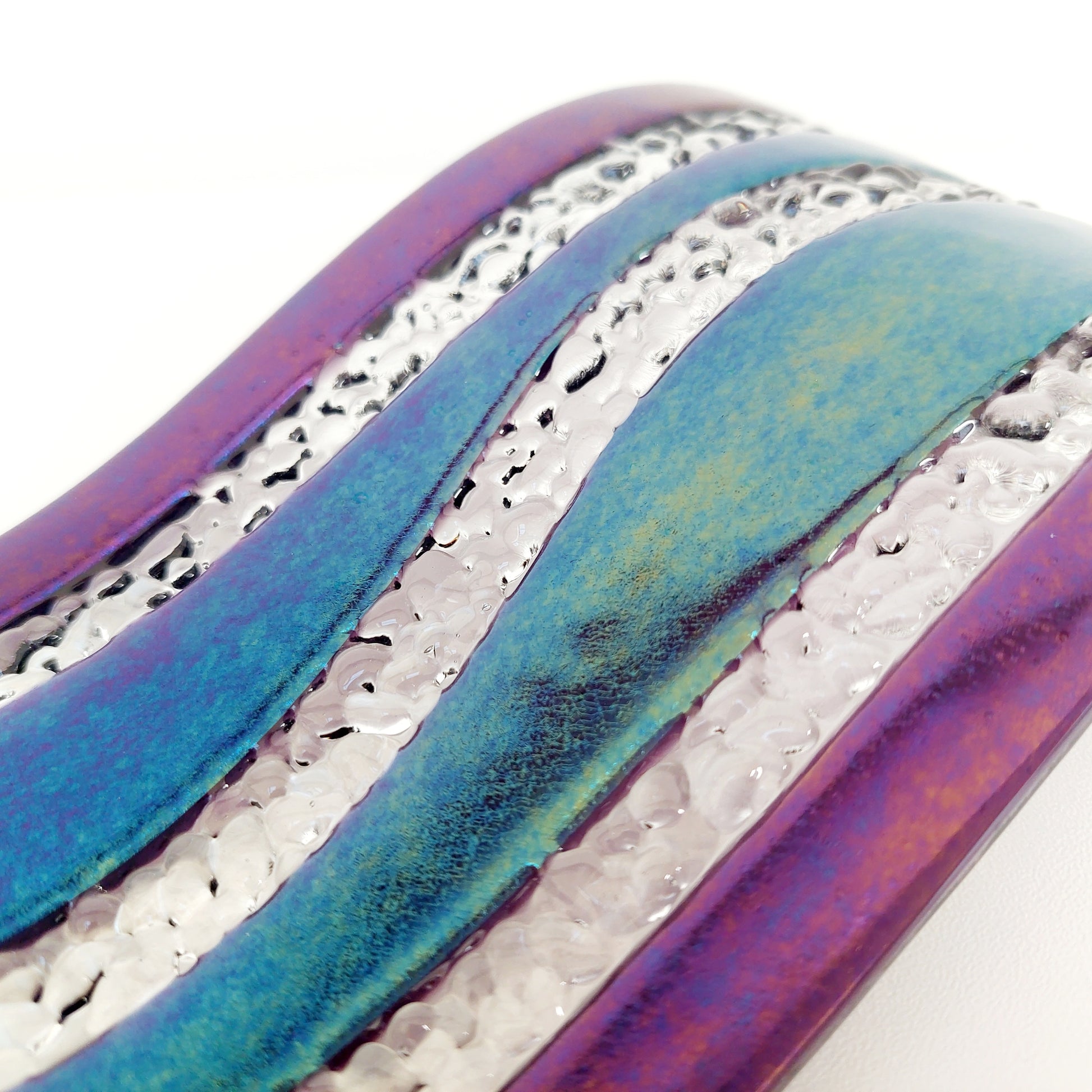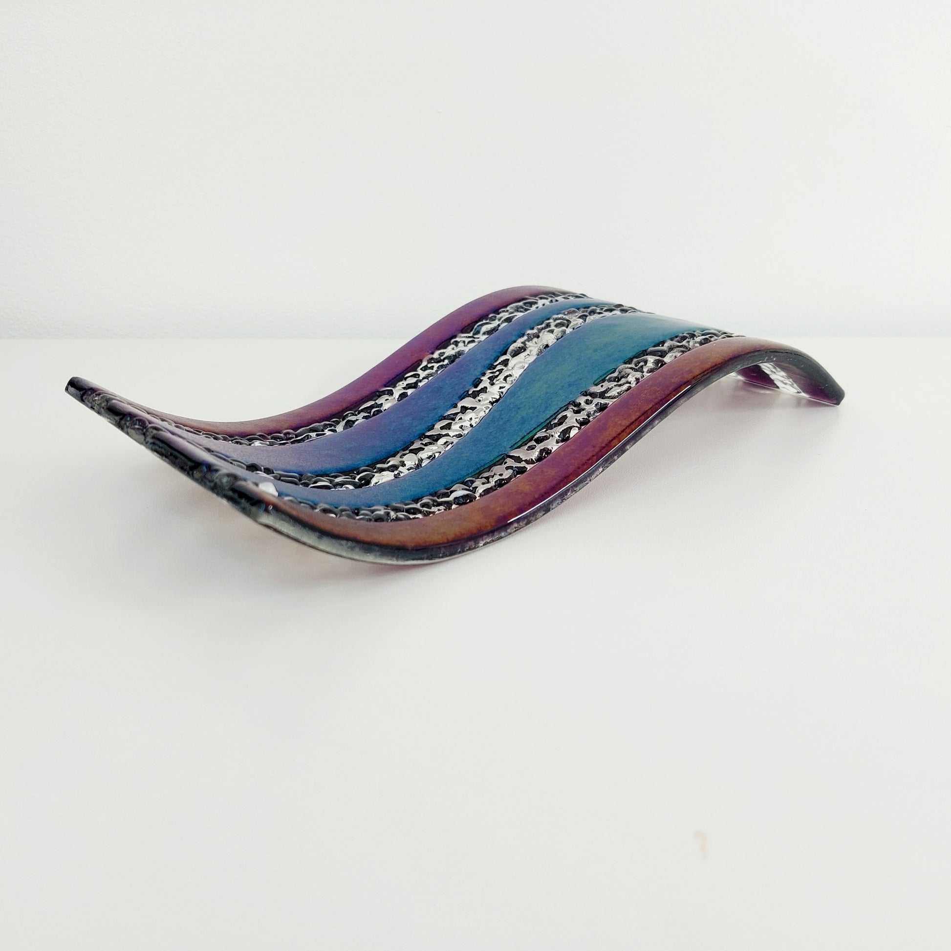This freestanding art glass sculpture is made from iridescent amethyst and crystal-clear artisan glass, shaped into a flowing wave design. The surface reflects light beautifully, creating a soft rainbow shimmer that shifts between pewter and warm gold tones. This effect is especially visible in low light or when viewed from different angles.