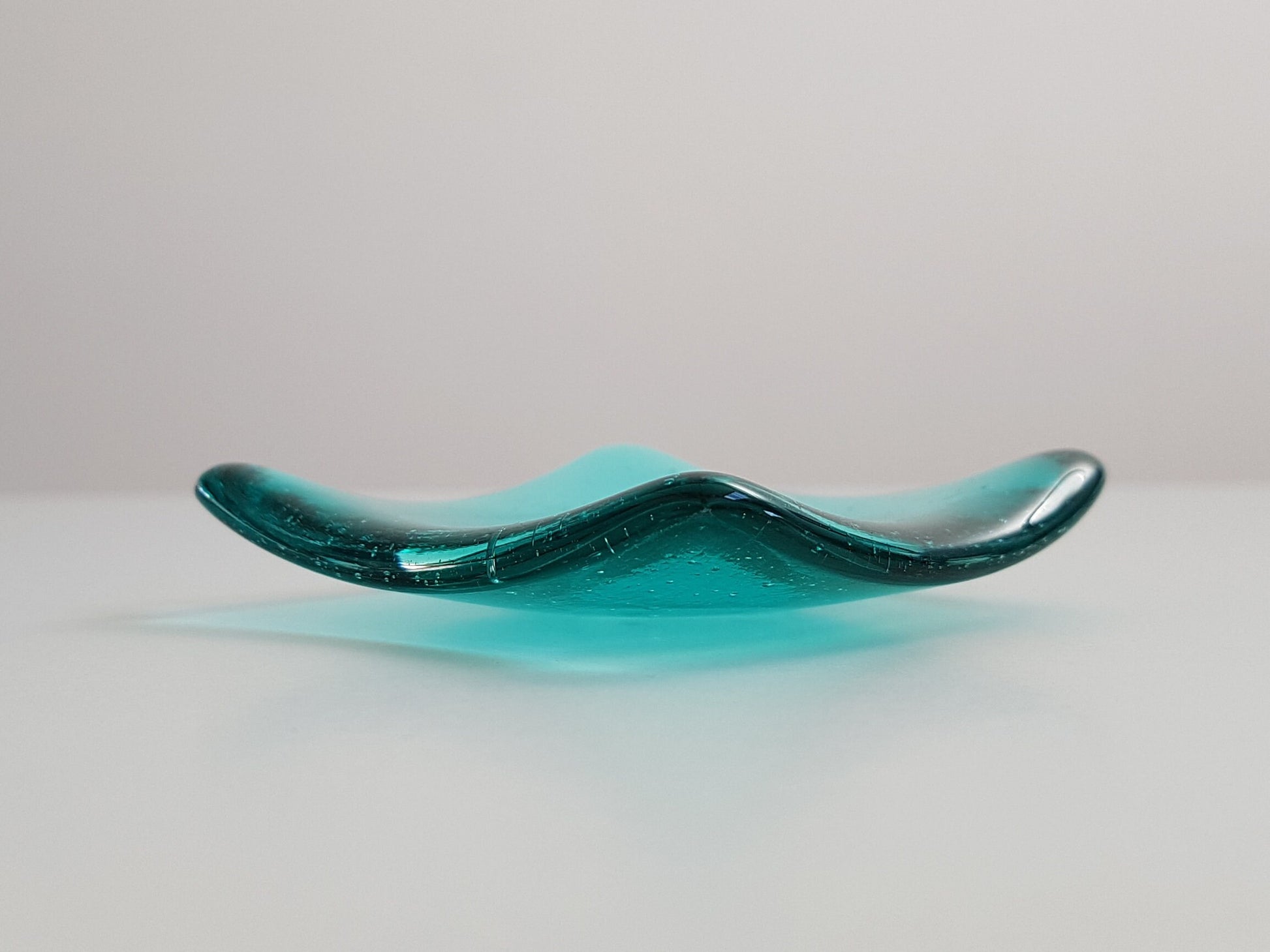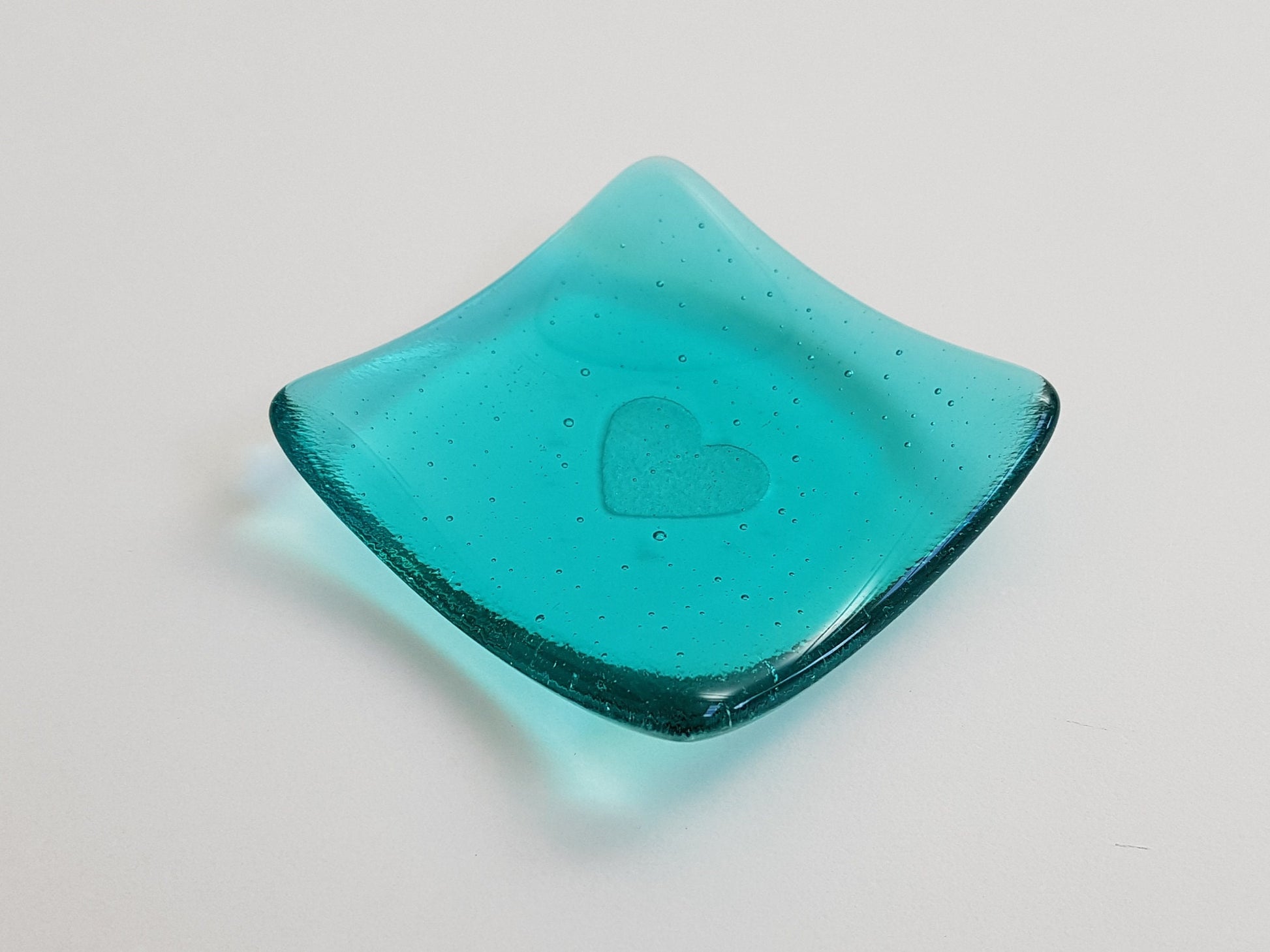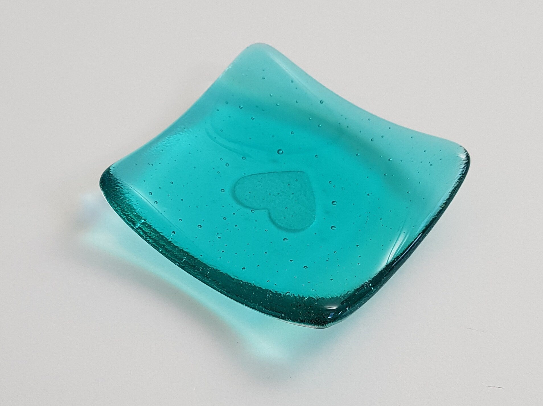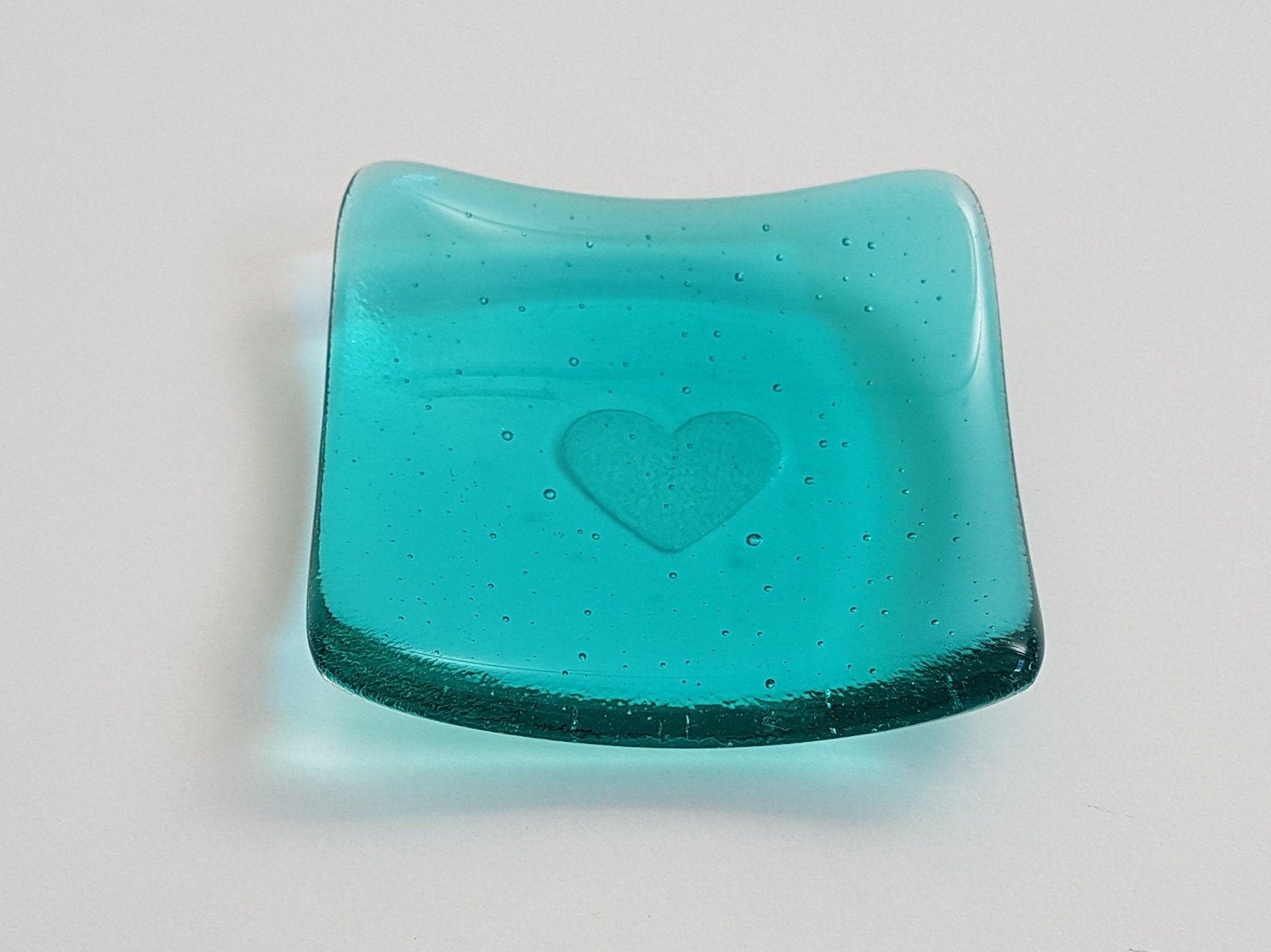 The trinket dish was handmade from transparent light aqua artisan glass and has a small heart kiln-carved (embossed) into the bottom of the glass. ***The glass is a lovely pale sea green colour - similar to turquoise, although more green than blue in appearance.