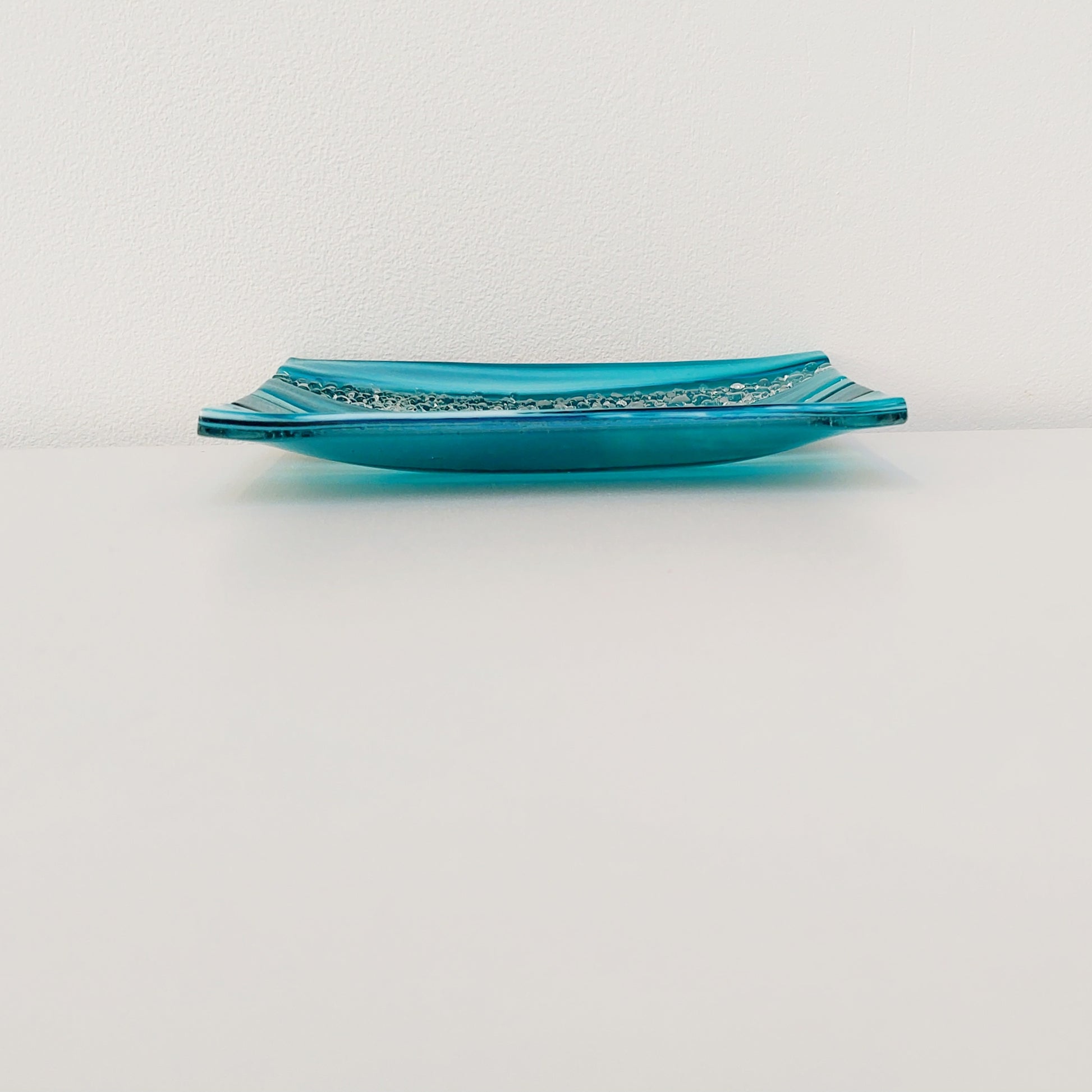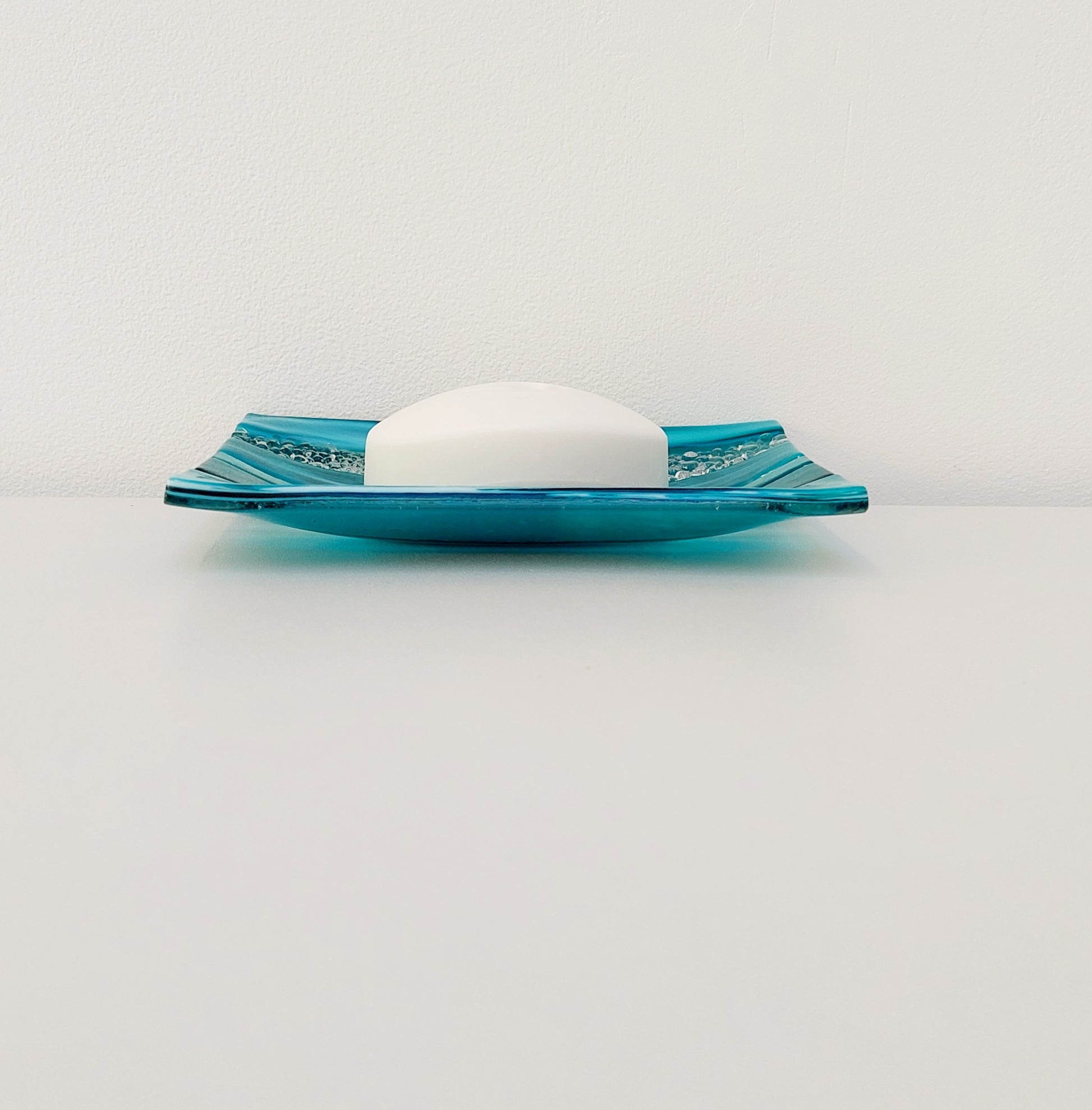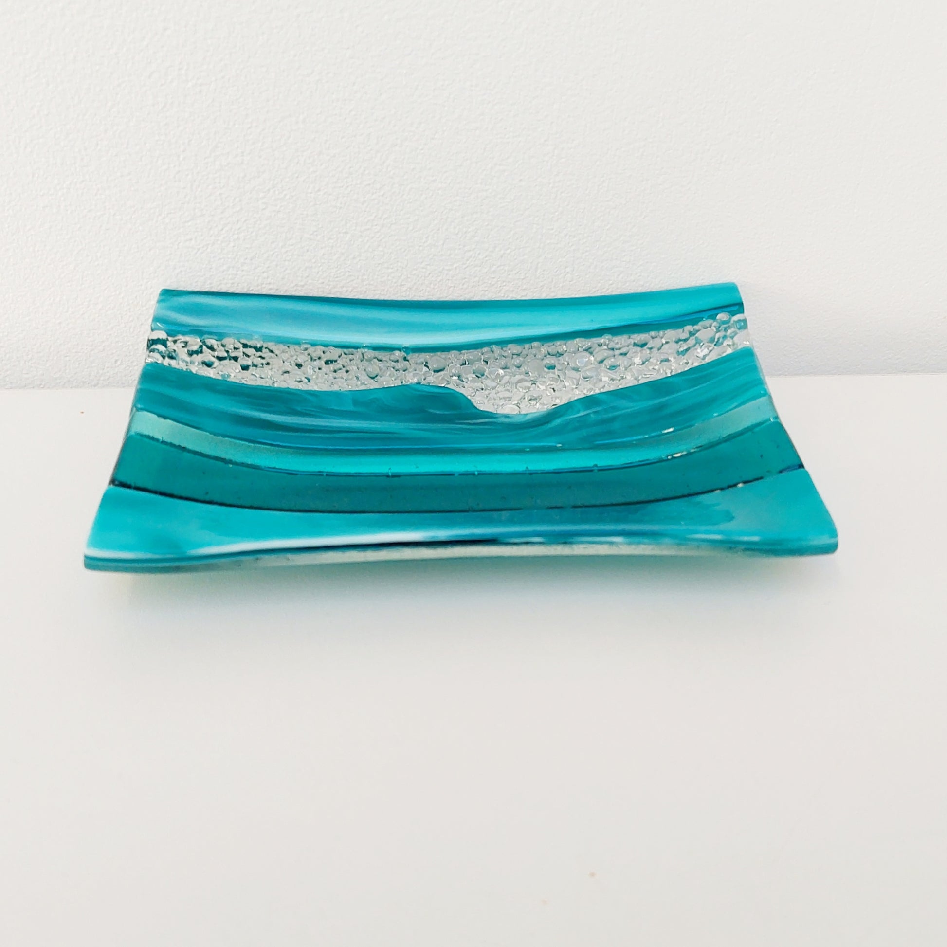 Aqua & Teal Glass Art Plate, Handmade Textured Soap Tray