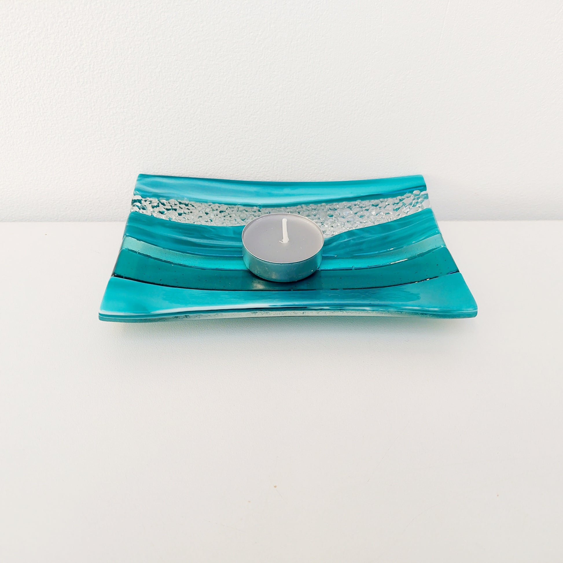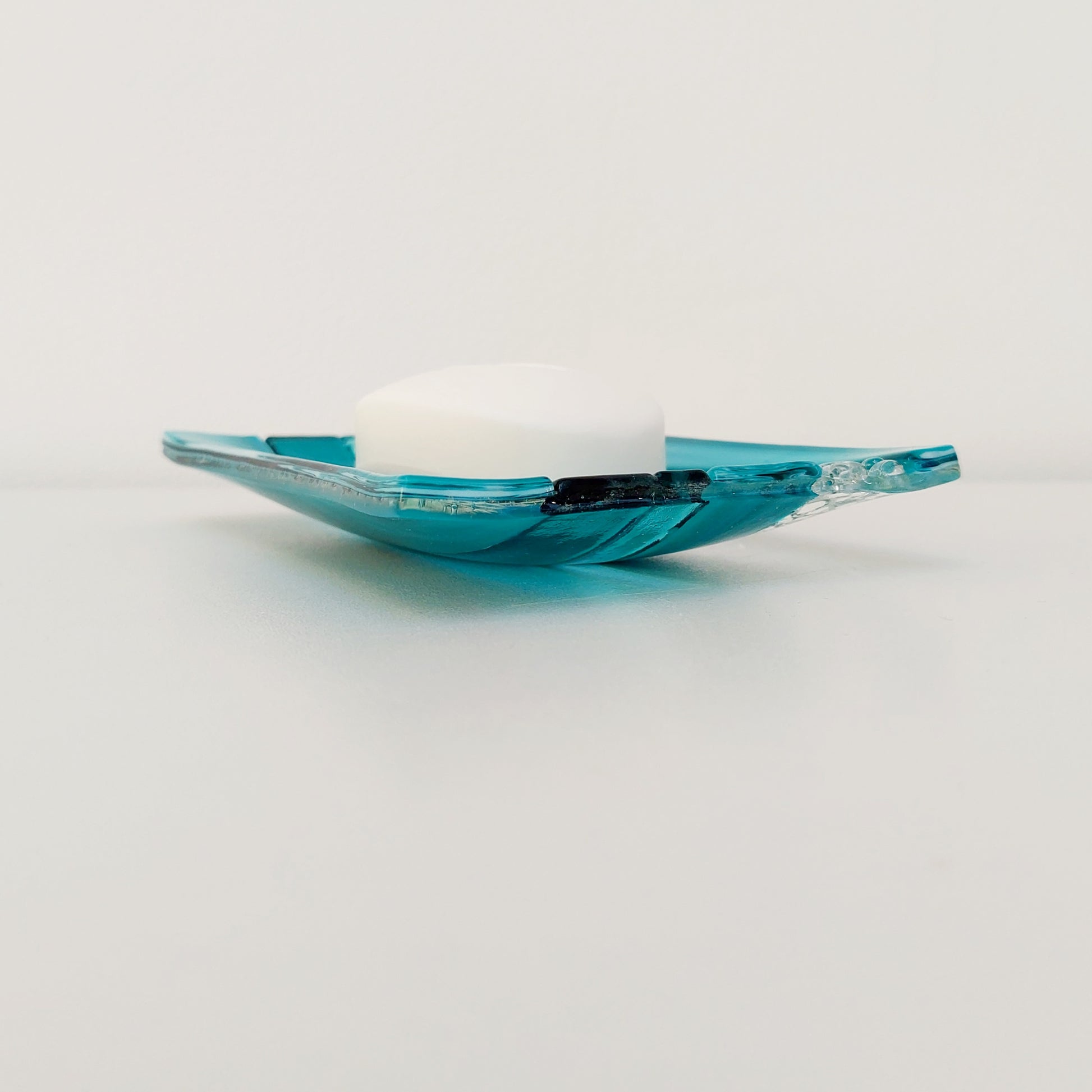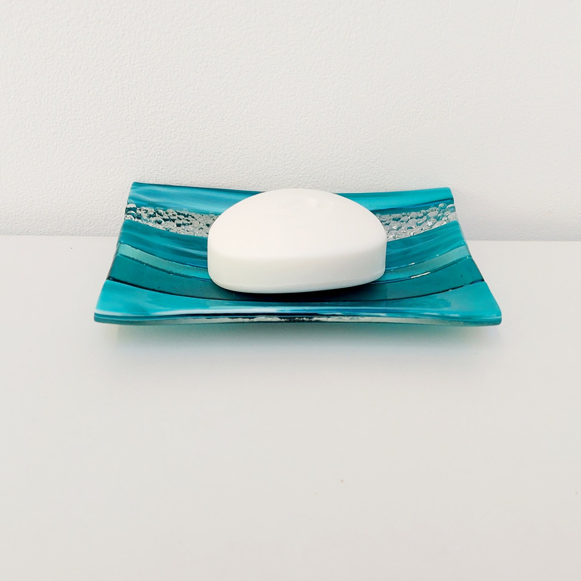 Aqua & Teal Glass Art Plate, Handmade Textured Soap Tray