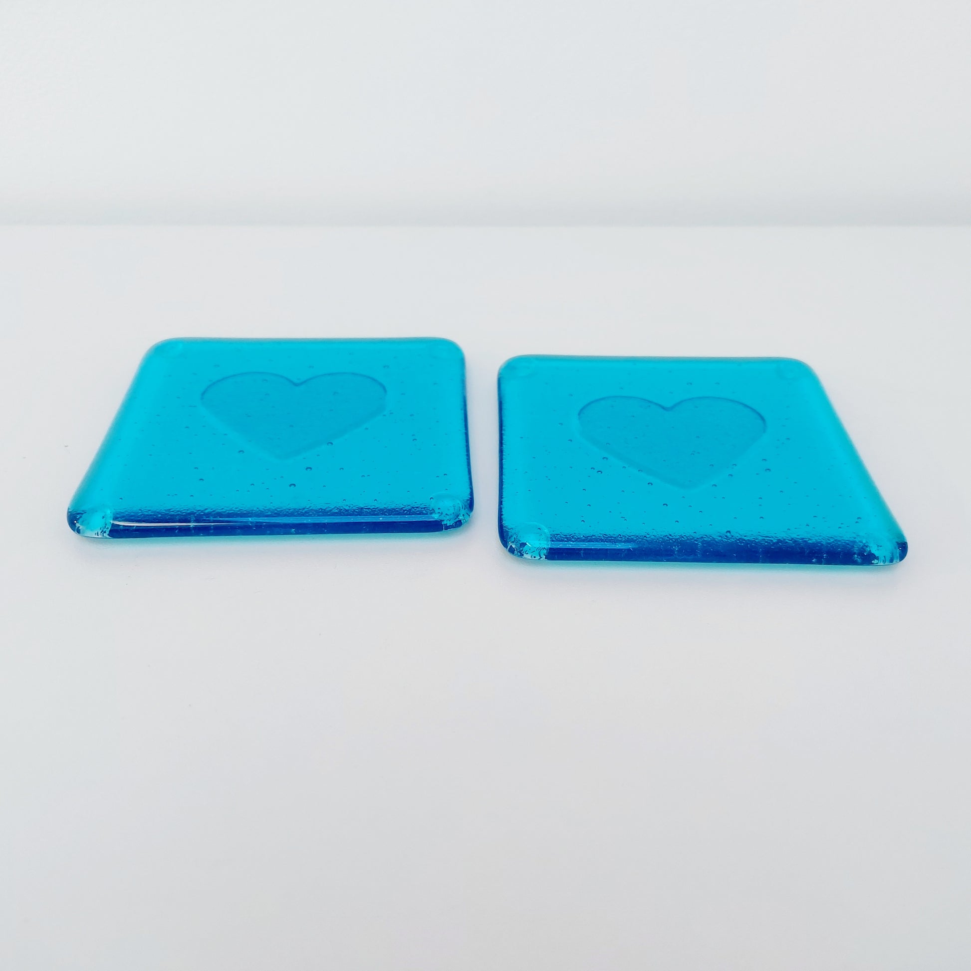 Add a touch of elegance and love to your table with this handcrafted glass coaster, made from transparent light turquoise artisan glass. Designed to catch the light beautifully, it brings a soft pop of color and timeless charm to any space.