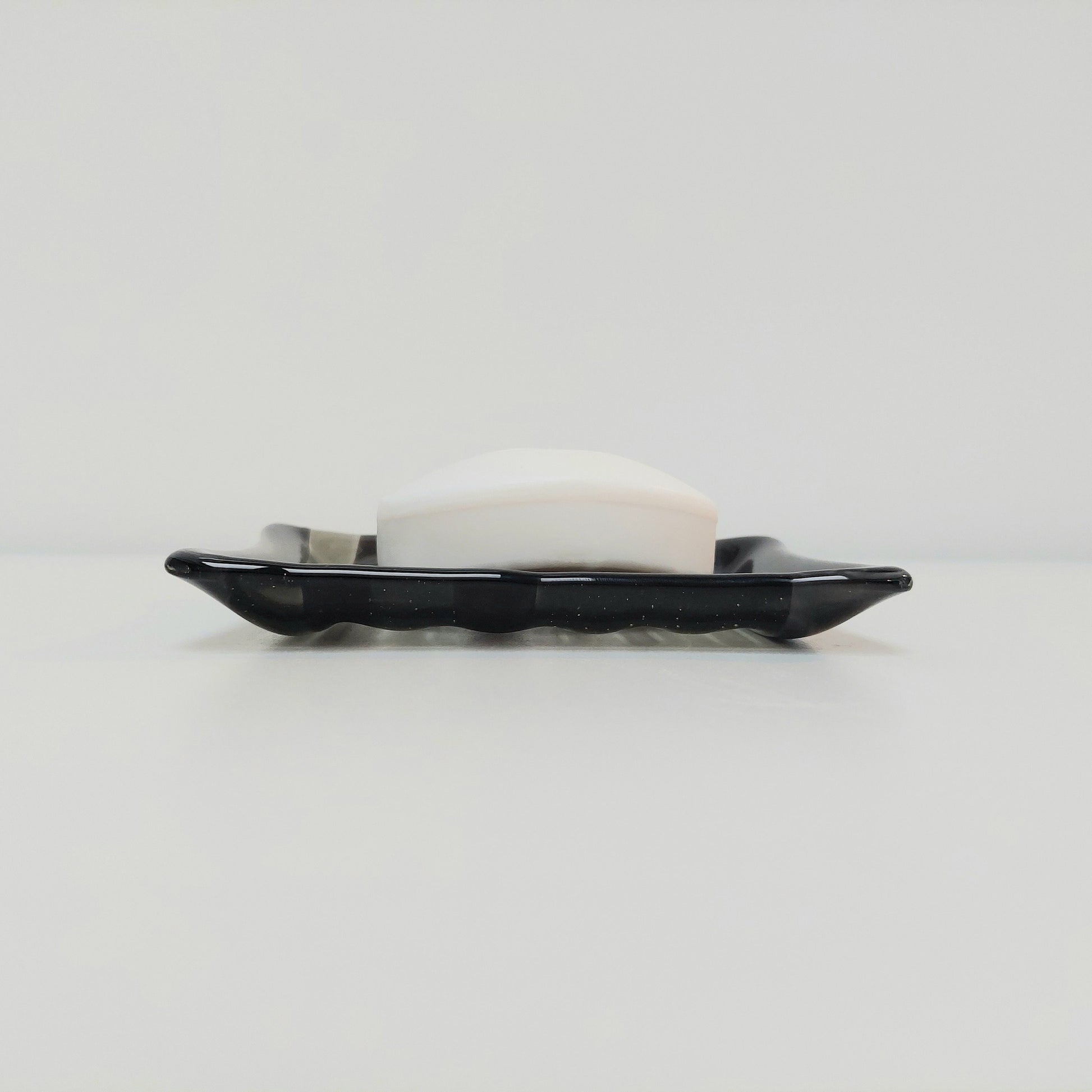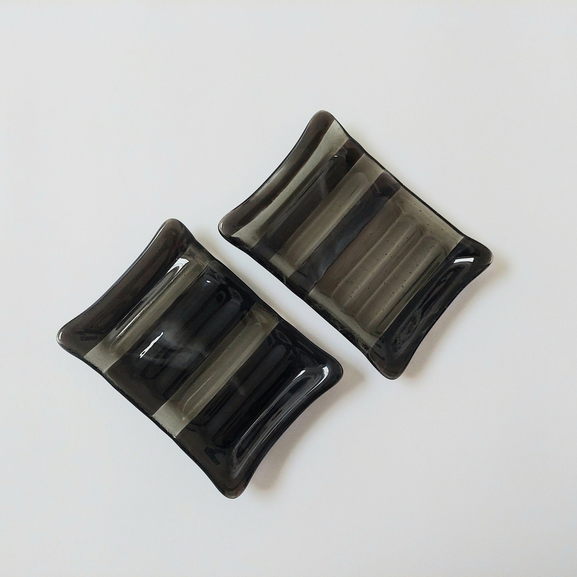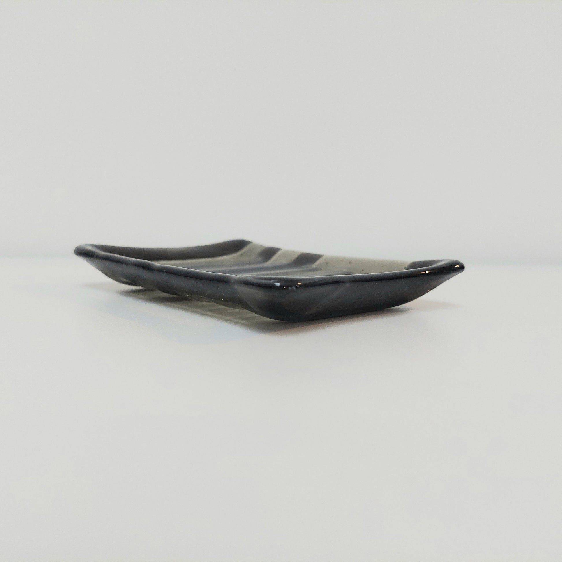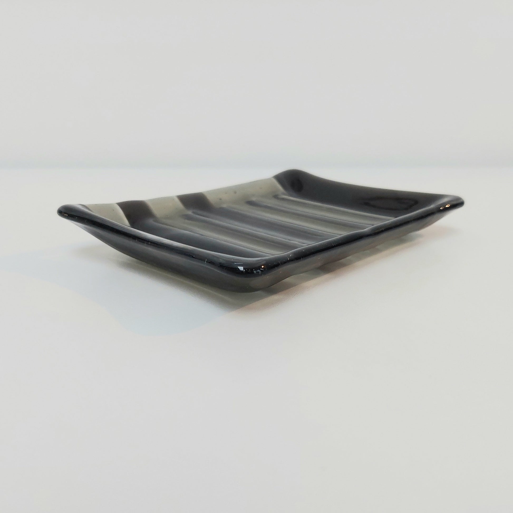 A grey glass art soap dish handmade from alternating strips of transparent 'Oregon Grey' and opalescent 'Stone Grey' artisan glass.