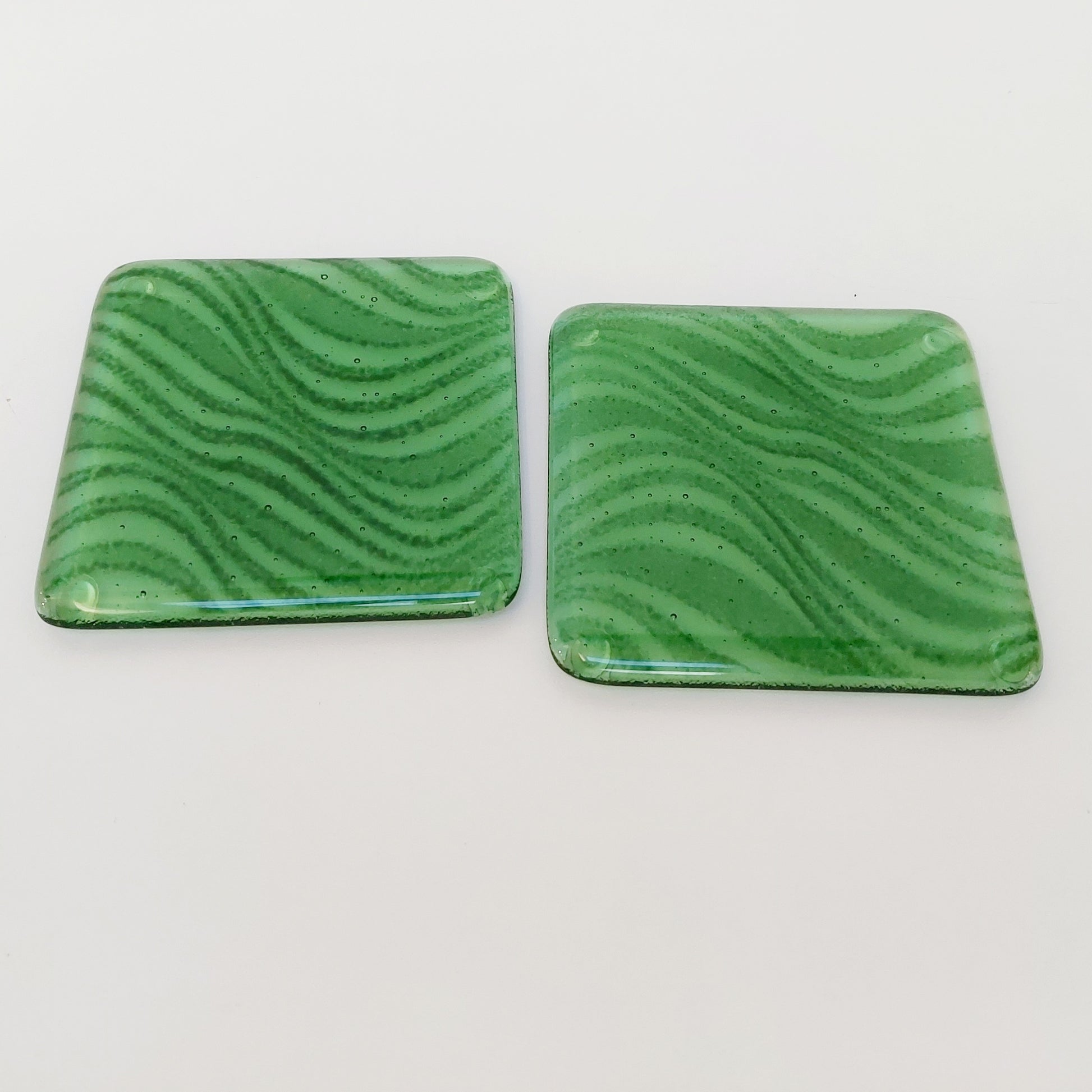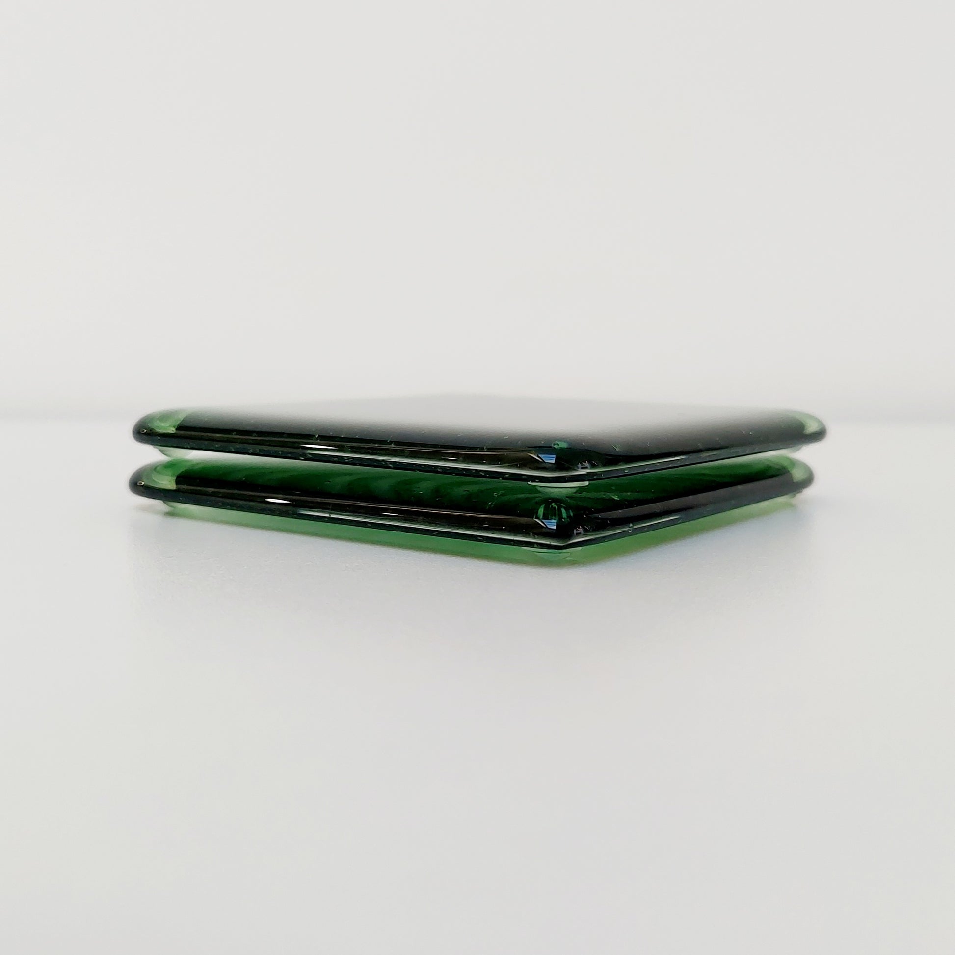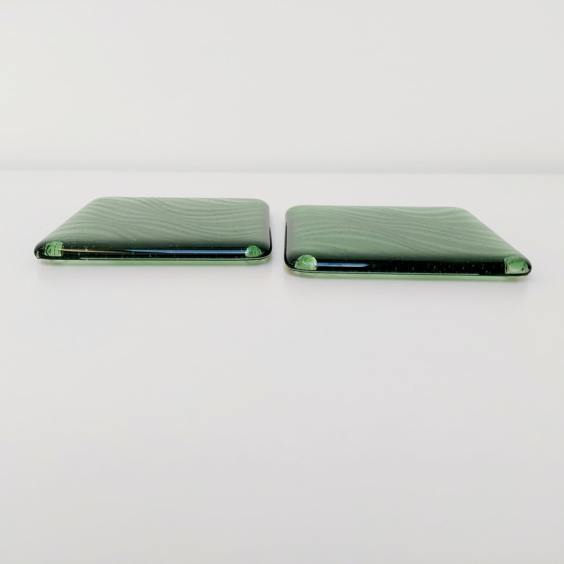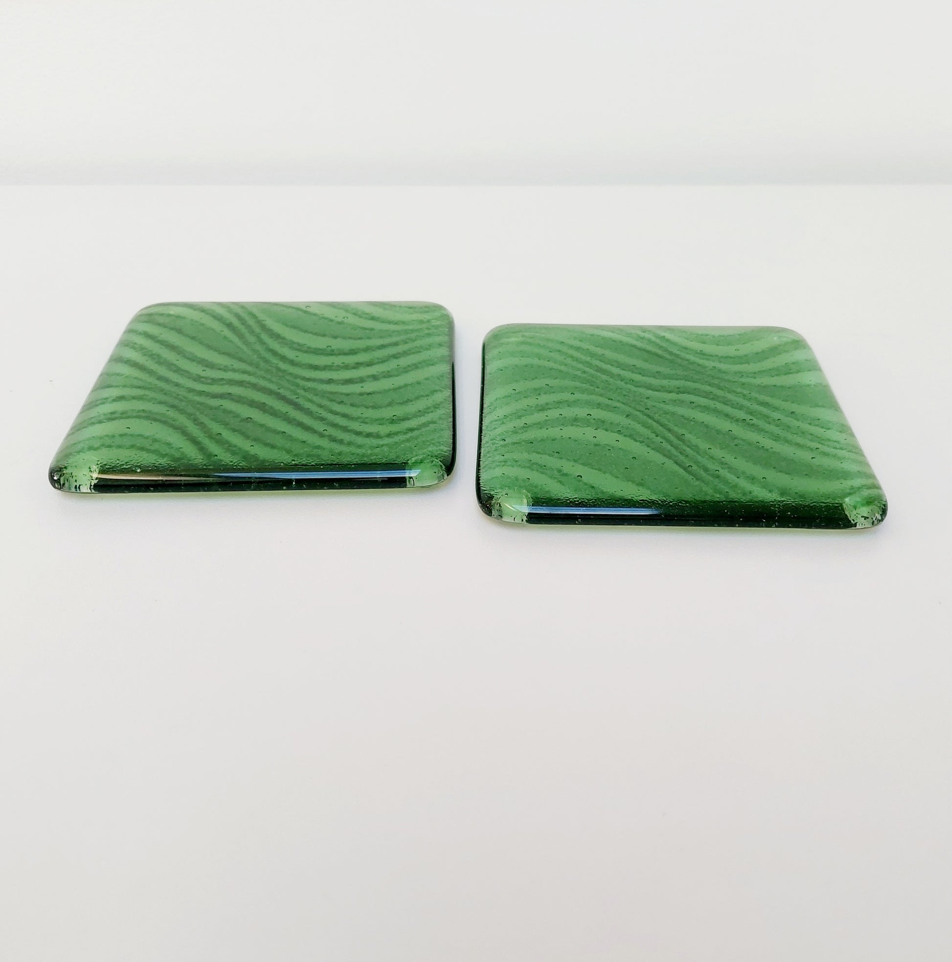 The coasters were handmade from transparent leaf green and dark aventurine green artisan glass.
