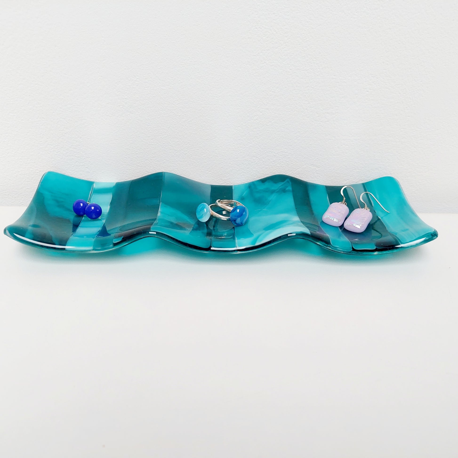 The dish has three distinct sections. It was created by blending teal and aqua artisan glass. The predominant colour of the dish is a green based teal - similar to the colour of a peacock feather.