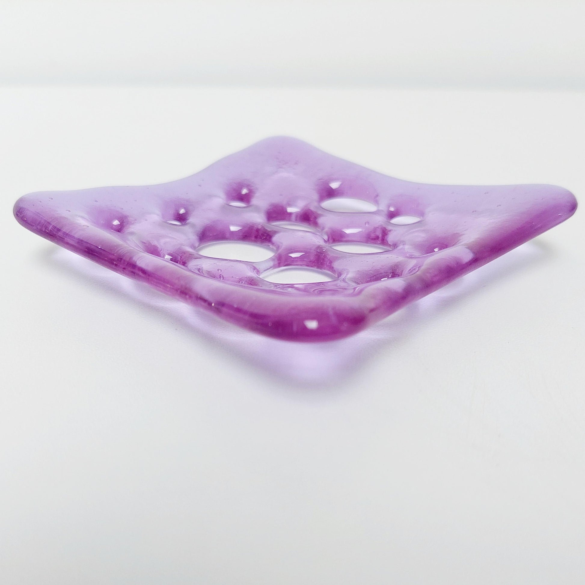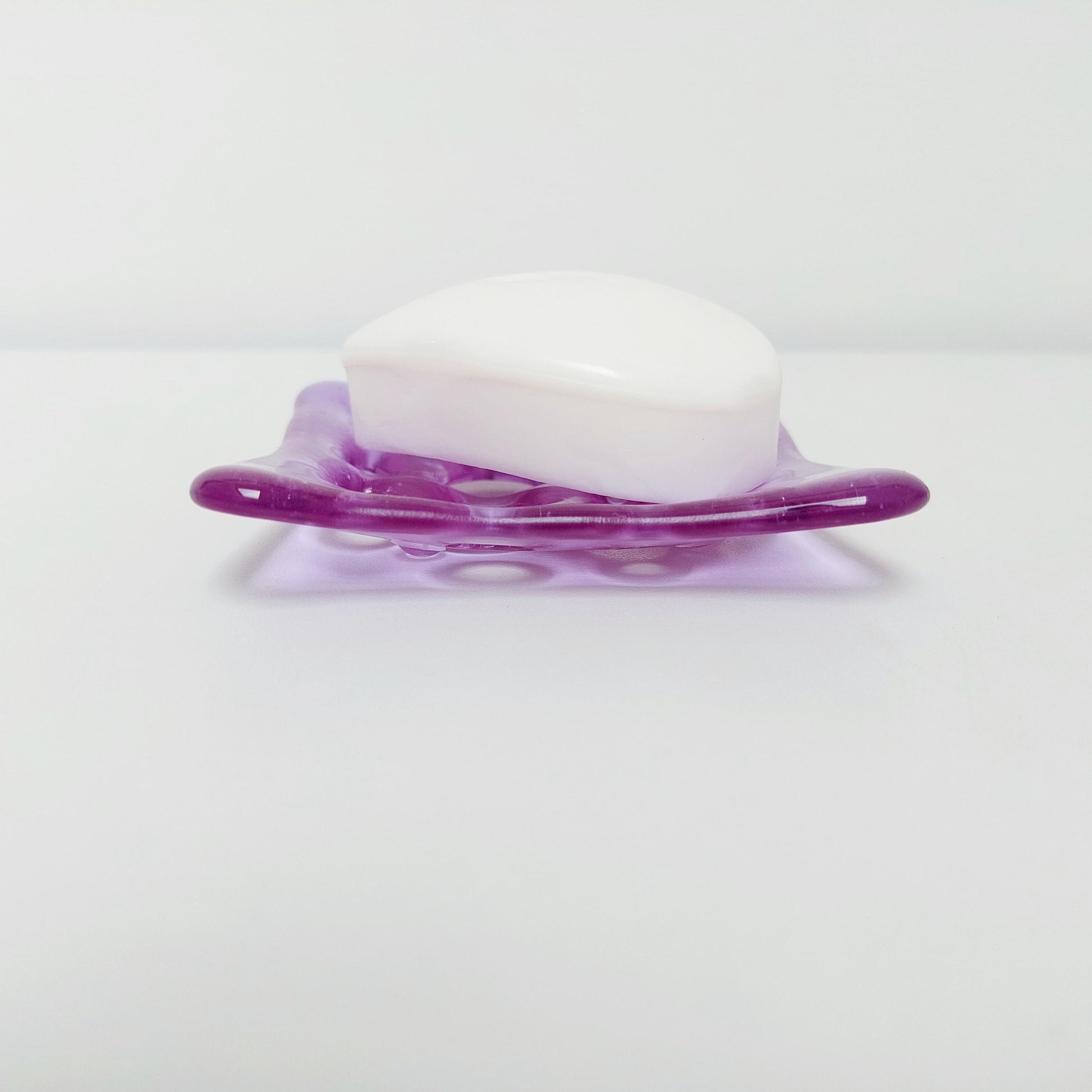 A unique soap dish handcrafted in the Lake District from transparent lilac artisan glass.
