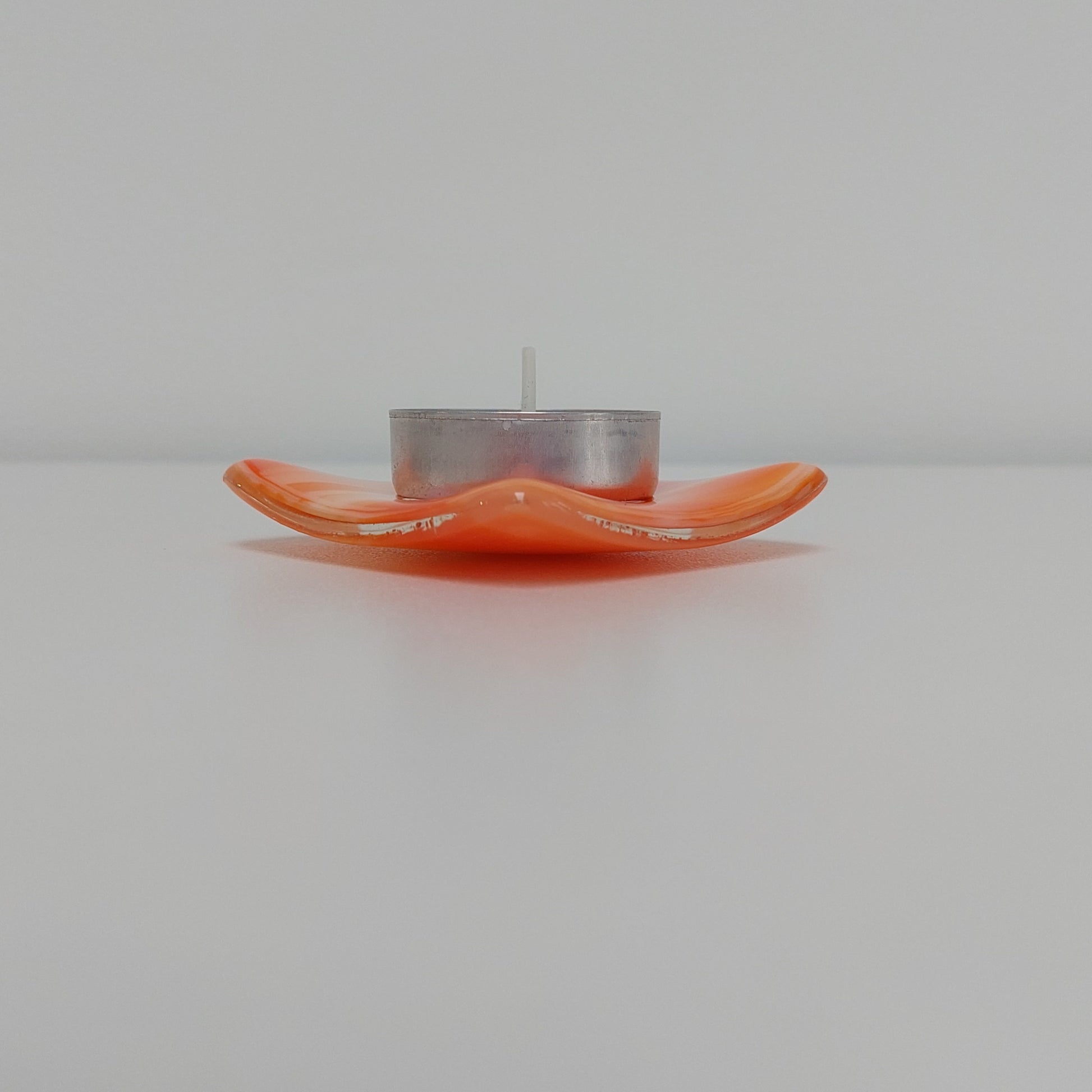 The dish was handmade from different shades of orange opalescent artisan glass.