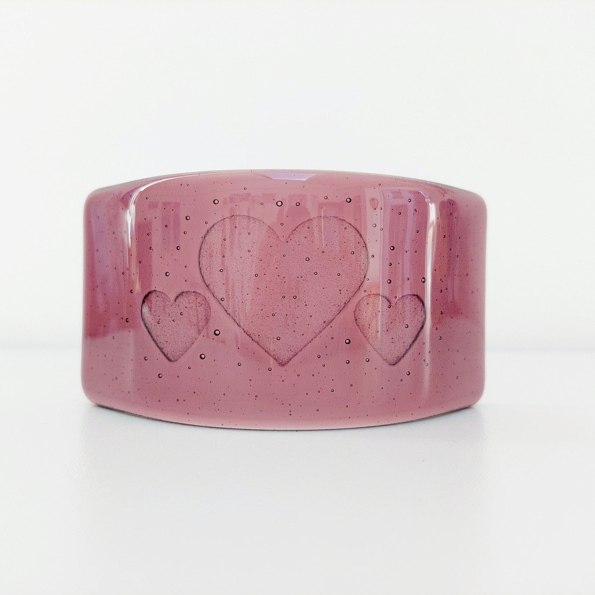 Three hearts have been kiln carved (embossed) into the glass on the interior of the curve.