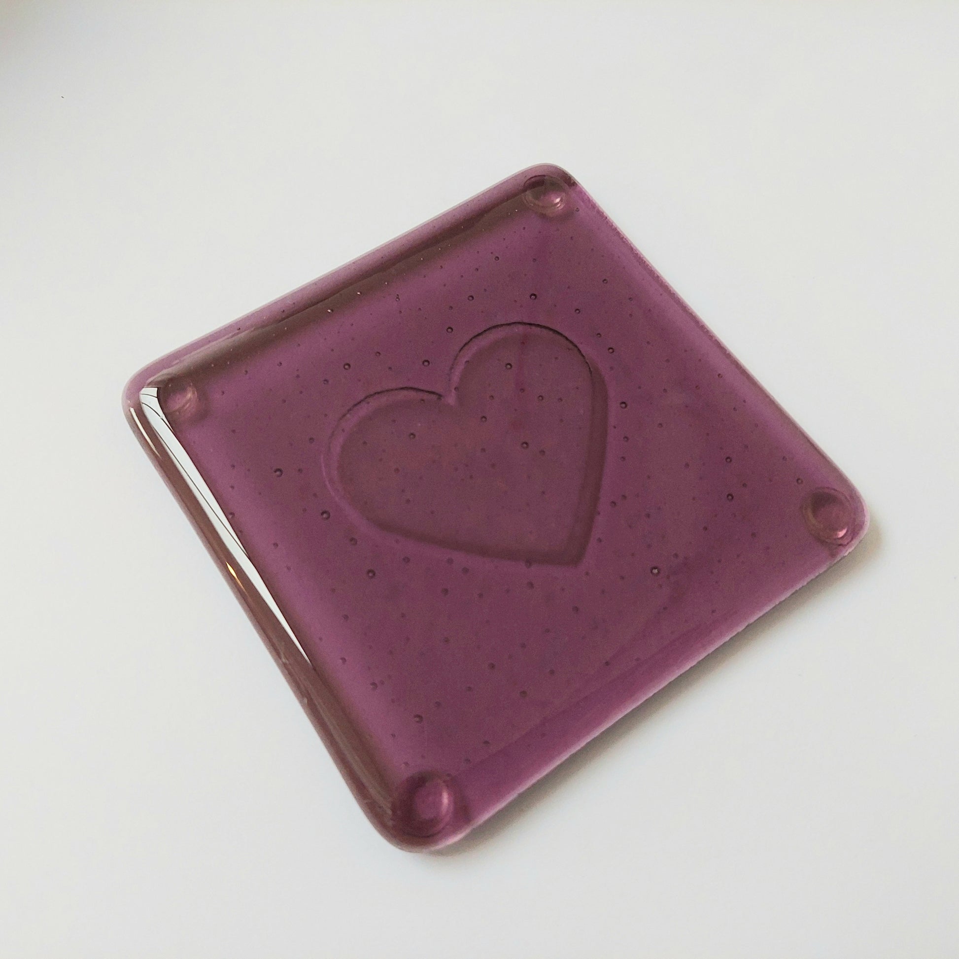 Plum Glass Coasters with a Kiln Carved Heart Design: Set of 4 Handmade Coasters