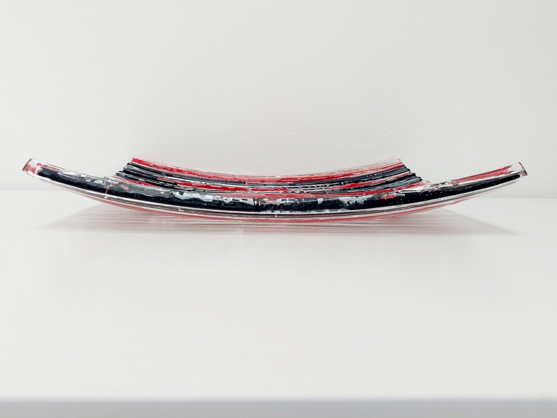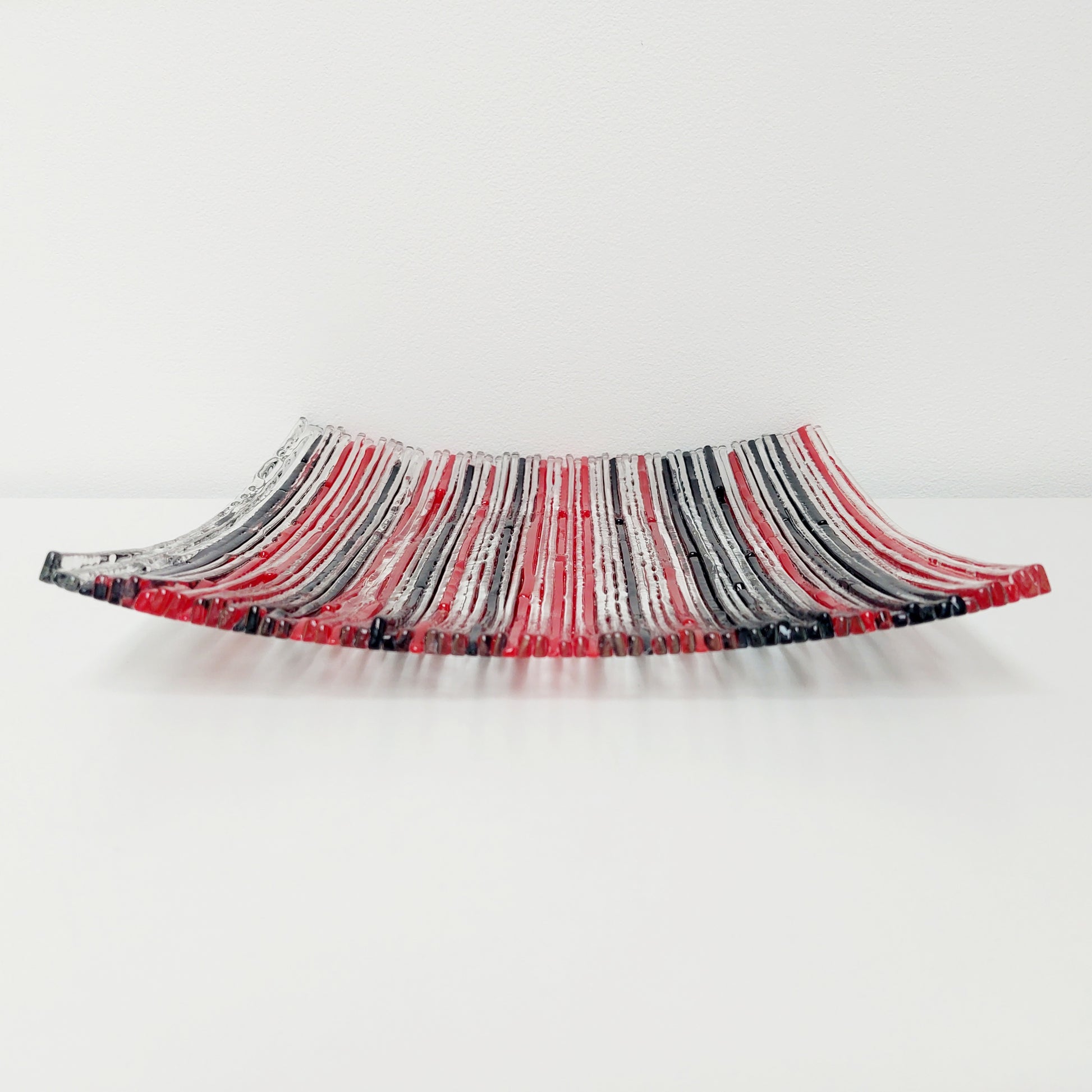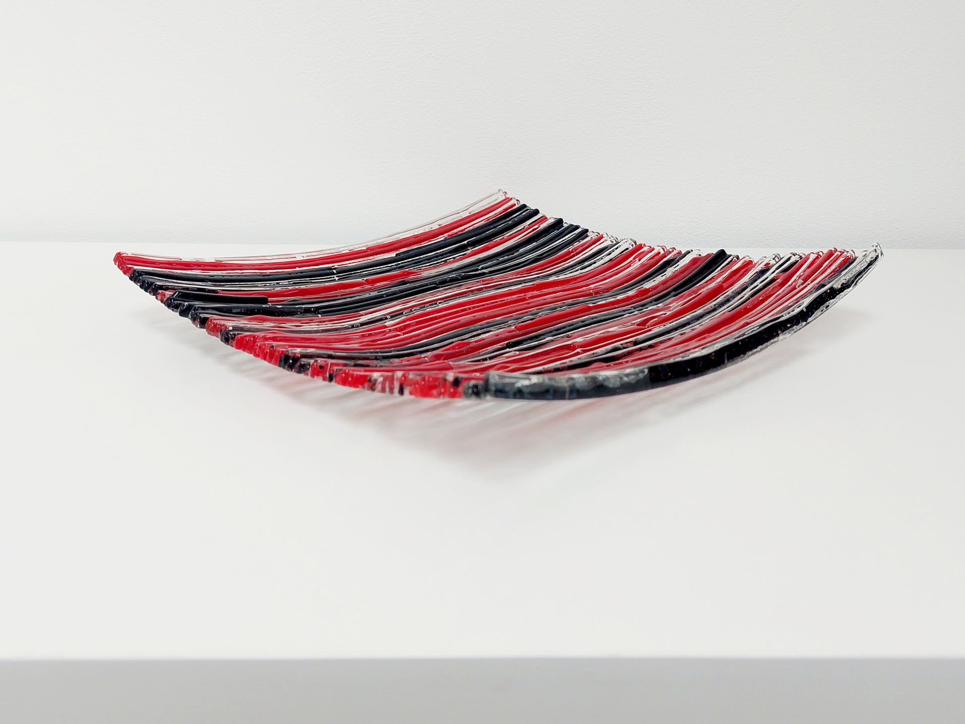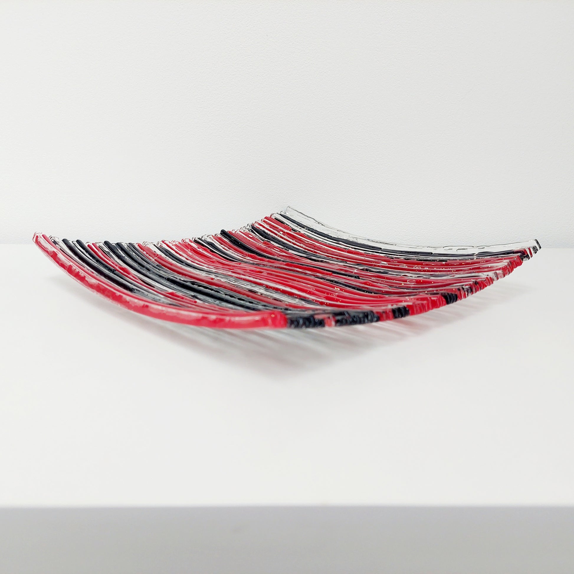 A large artisanal textured glass plate handcrafted from opalescent red, black and clear glass.