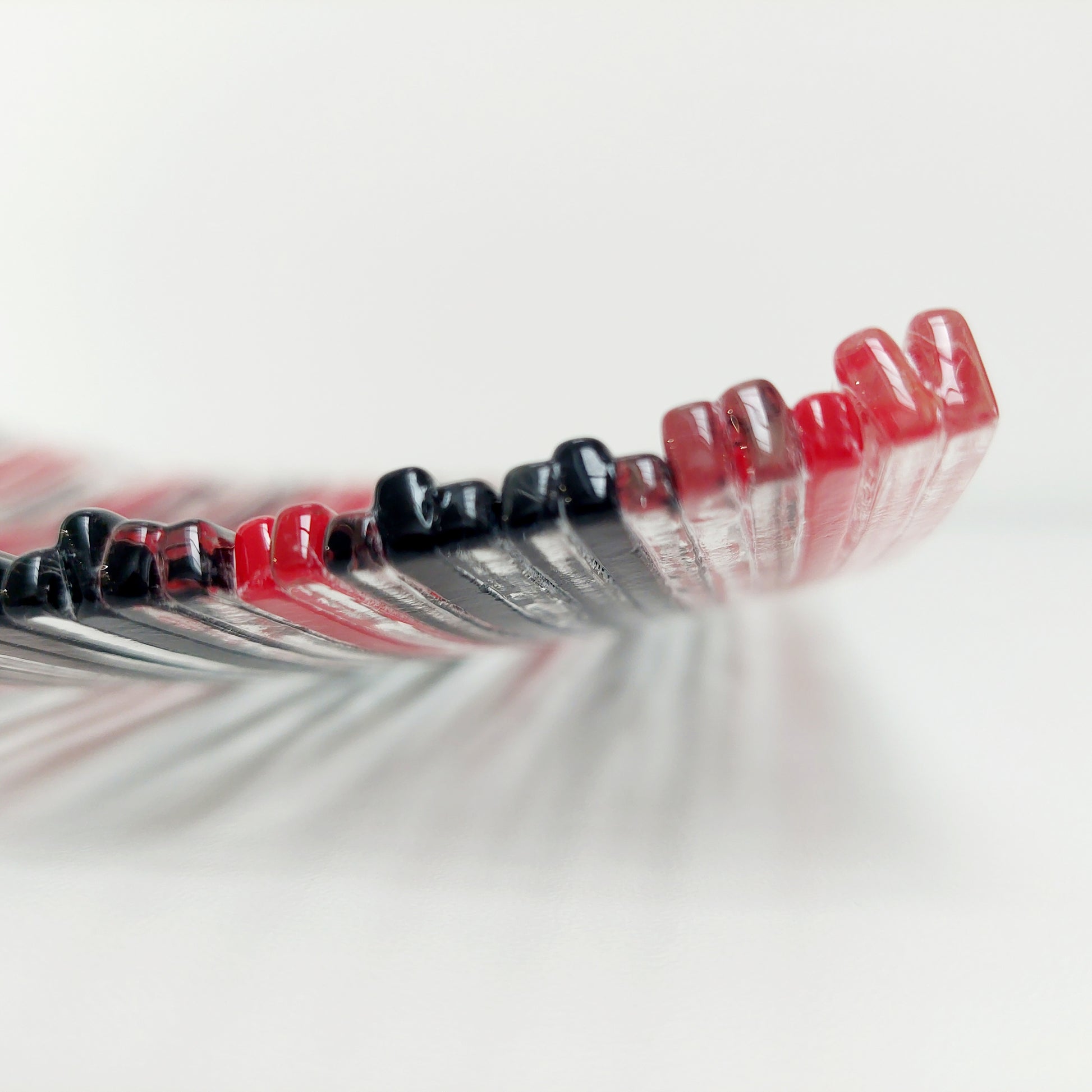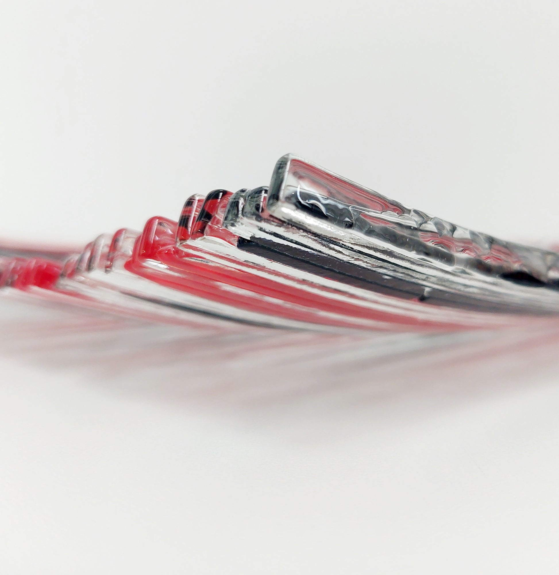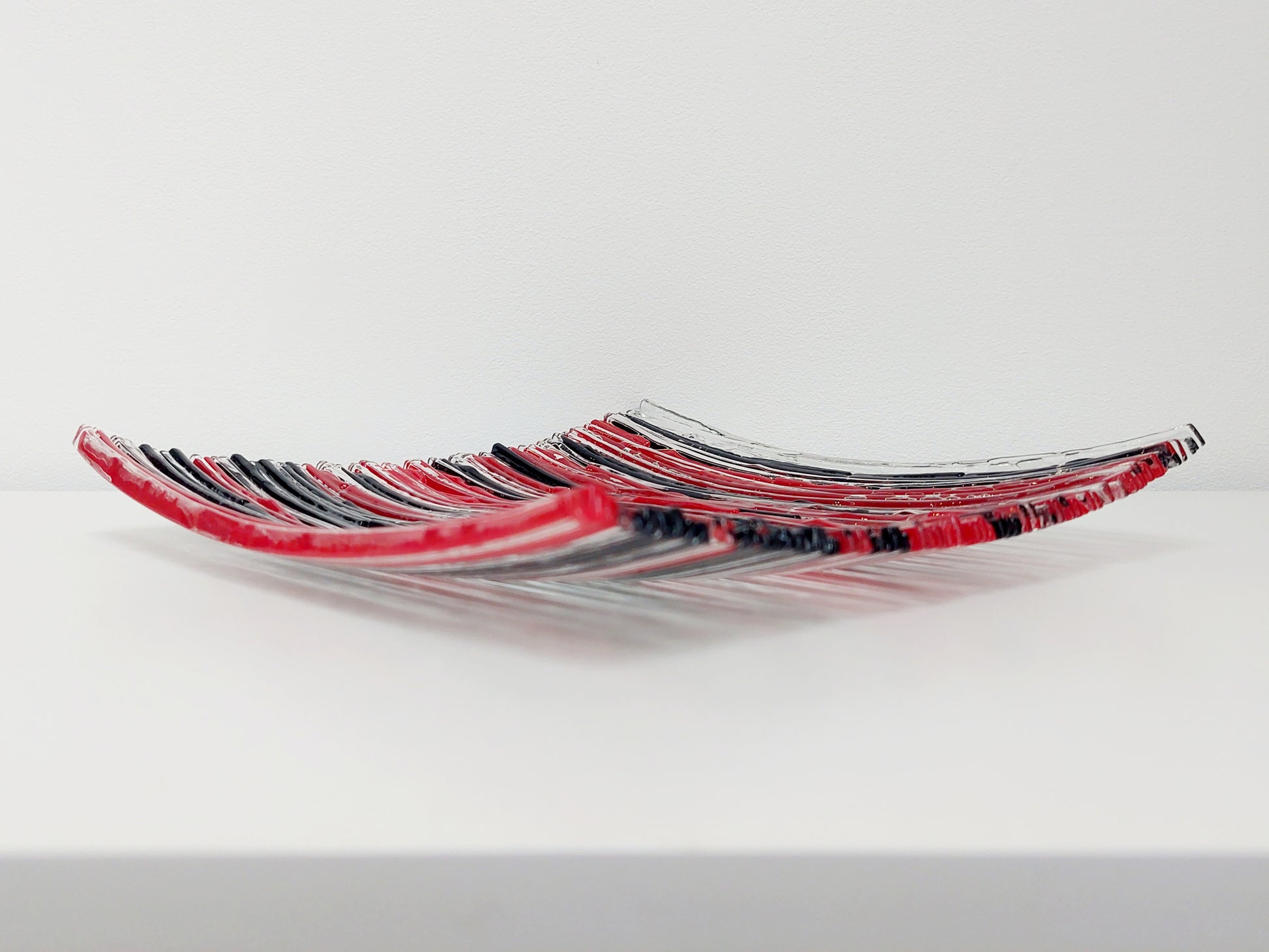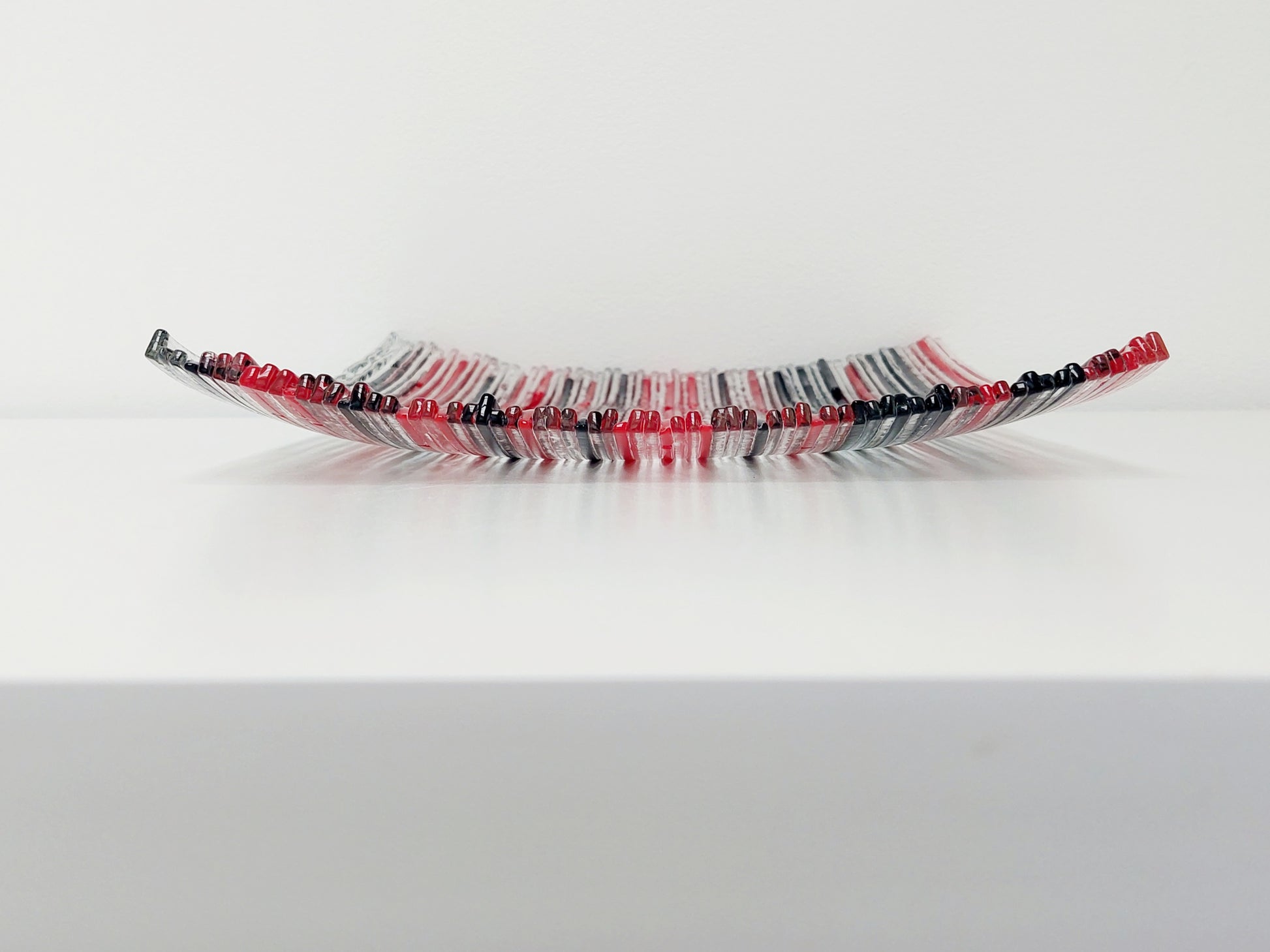 A large artisanal textured glass plate handcrafted from opalescent red, black and clear glass.