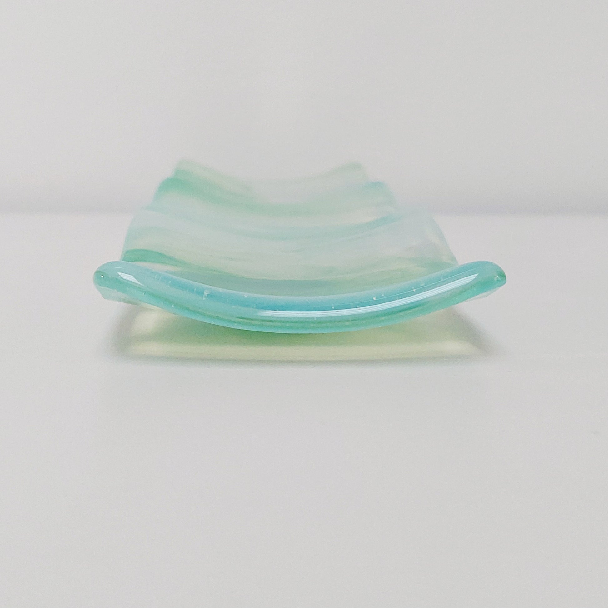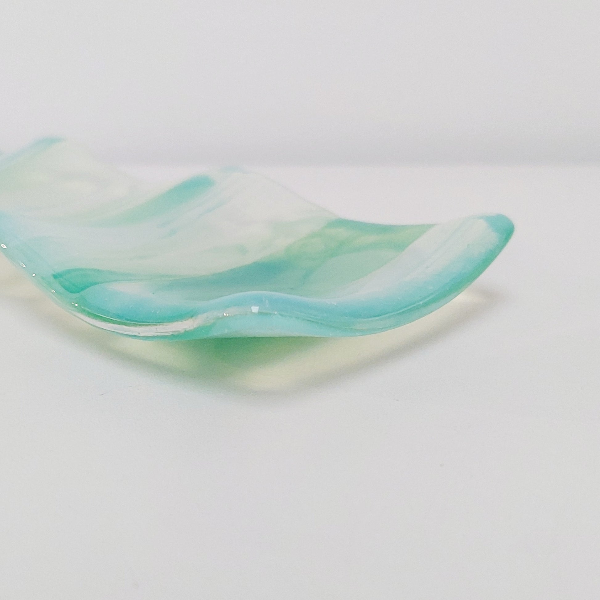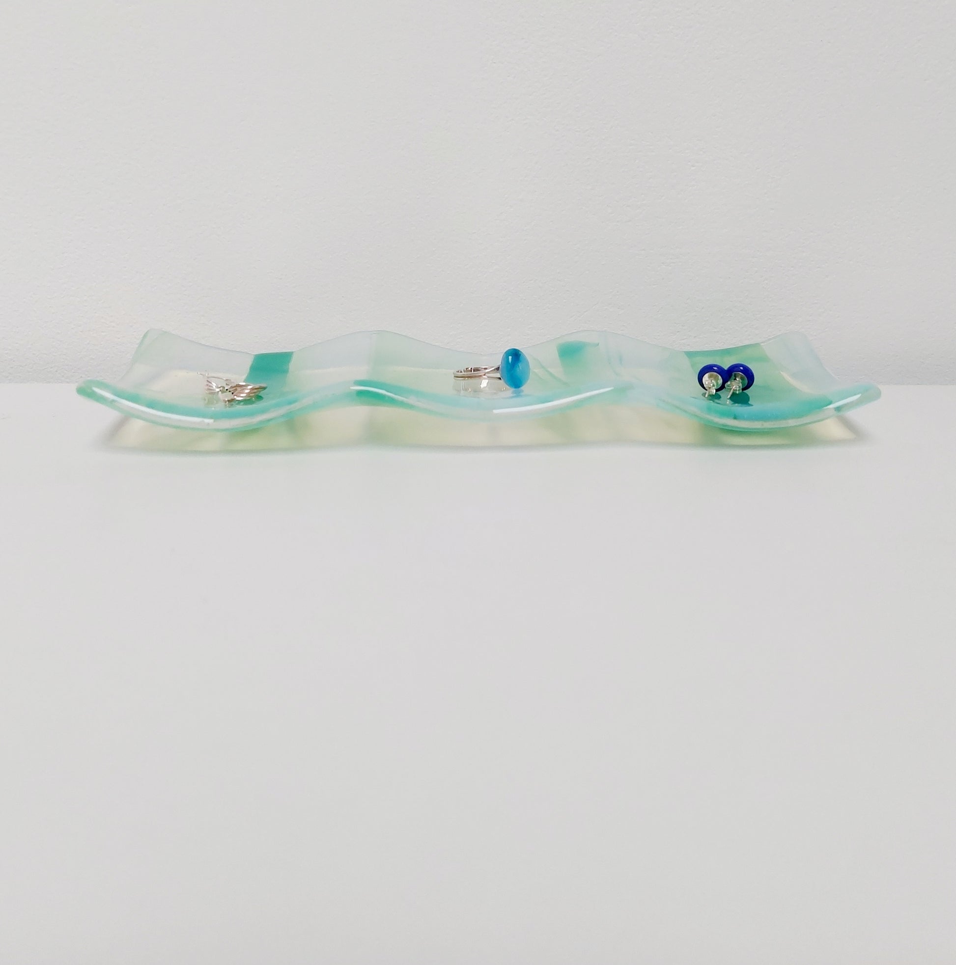 The rectangular sectional dish was handmade from a blend of light green, teal and opaline artisan glass. The opaline glass is a milky, semi-transluscent white colour. The predominant colour of the plate is light green with subtle blue undertones.