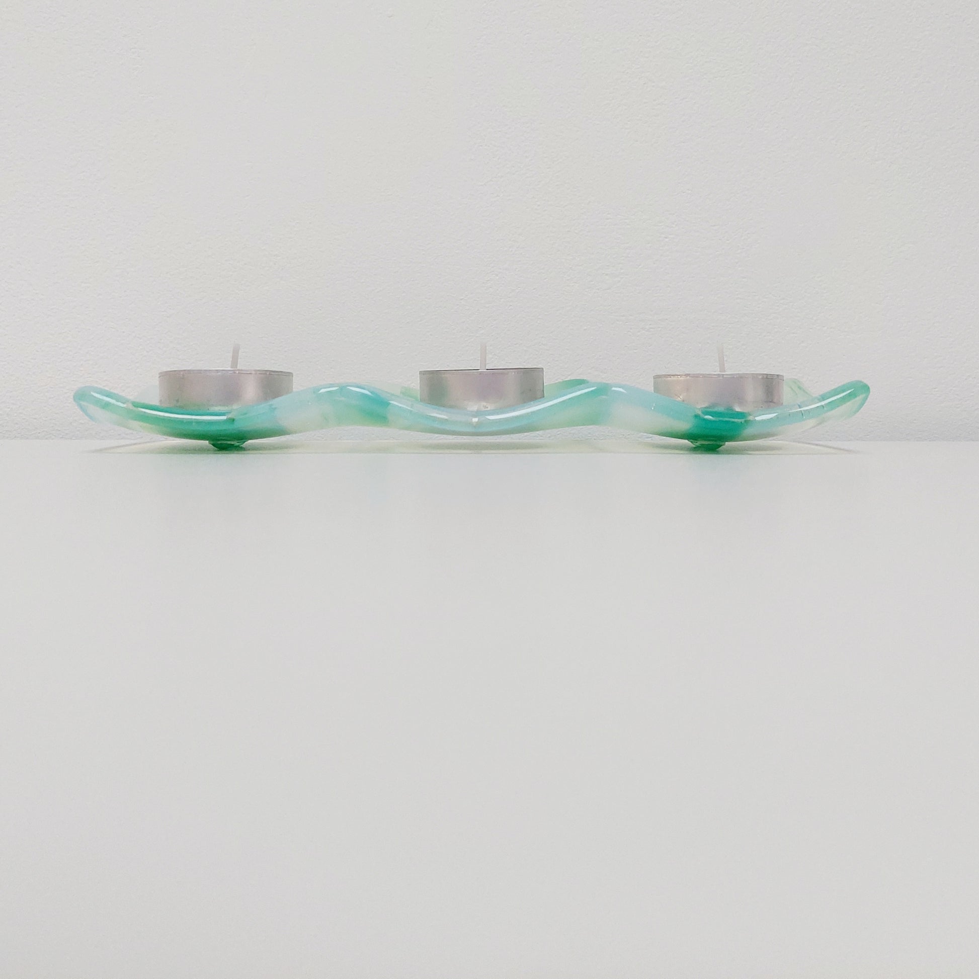 A pretty green glass tealight tray handcrafted in the Lake District; inspired by the natural landscape at Rydal Water.