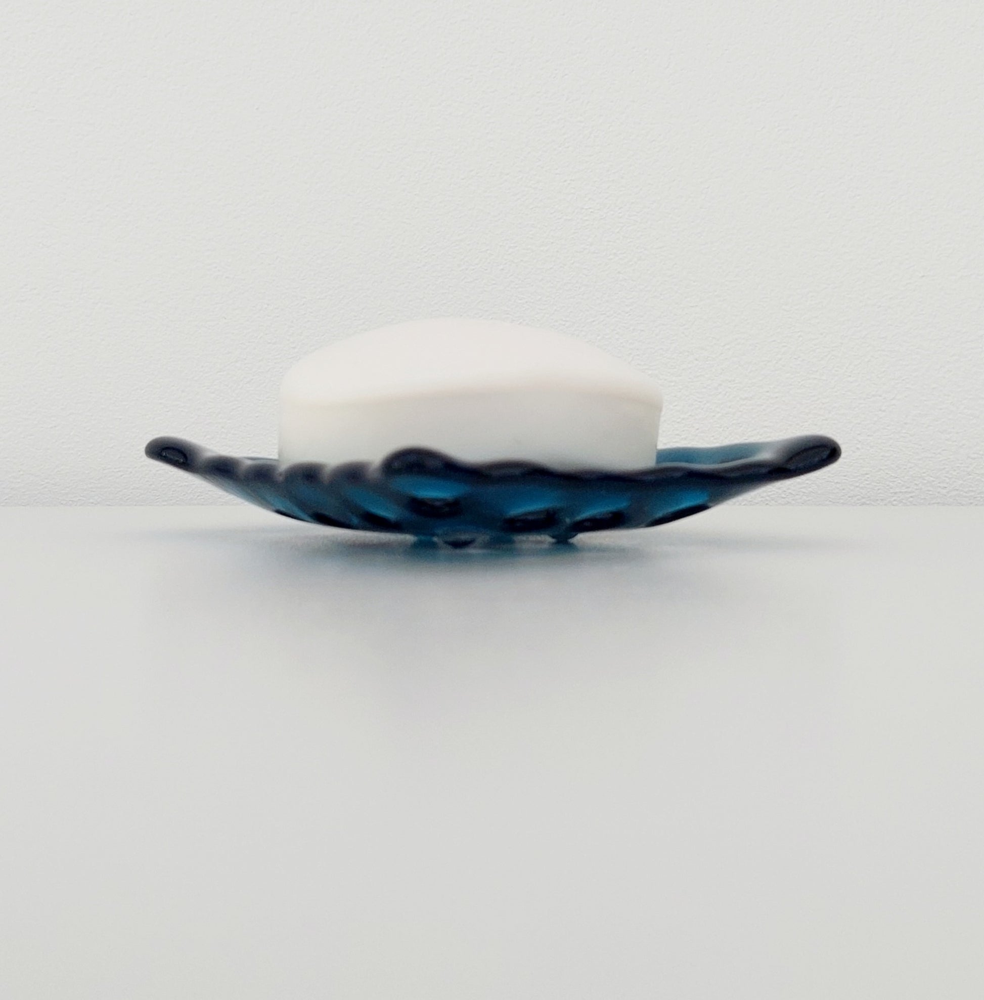 A glass art soap dish handcrafted in the Lake District from transparent sea blue artisan glass.