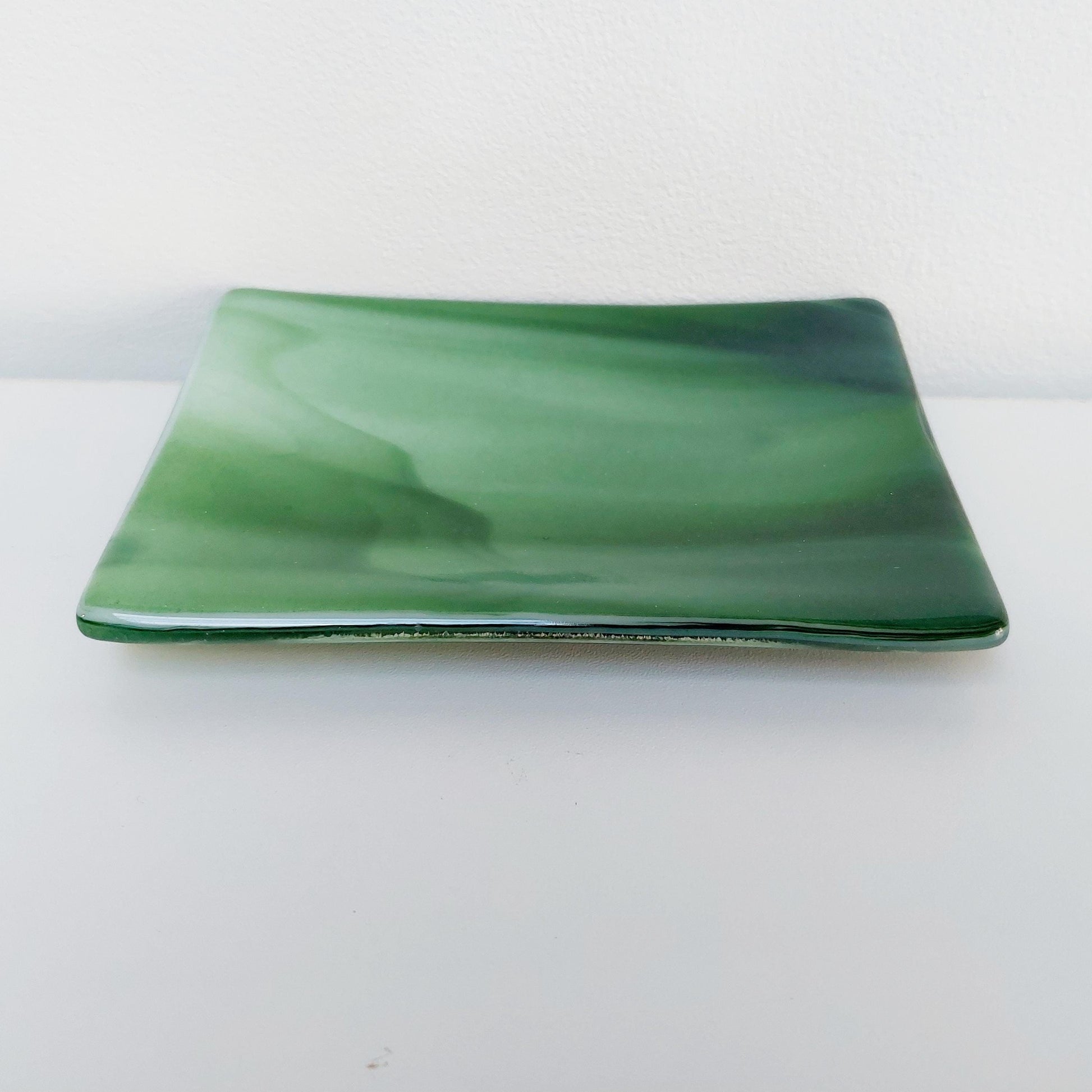 A little more about THE HANDCRAFTED PROCESS: The colour was achieved by fusing several layers of dark green transparent artisan glass powder into a sheet of pale moss green opalescent glass. This glass was hand cut to size and placed on top of a piece of crystal clear sheet glass cut to the same size. The prepared dish was then fired in the kiln over a 24 hour period. (***The glass was gradually heated up to just over 800 degrees Celsius, then cooled down very slowly to ensure that it annealed fully. This enabled the glass to strengthen and ensured its durability). The dish was then placed on top of a ceramic mould and fired in the kiln once more, in order to shape the piece.