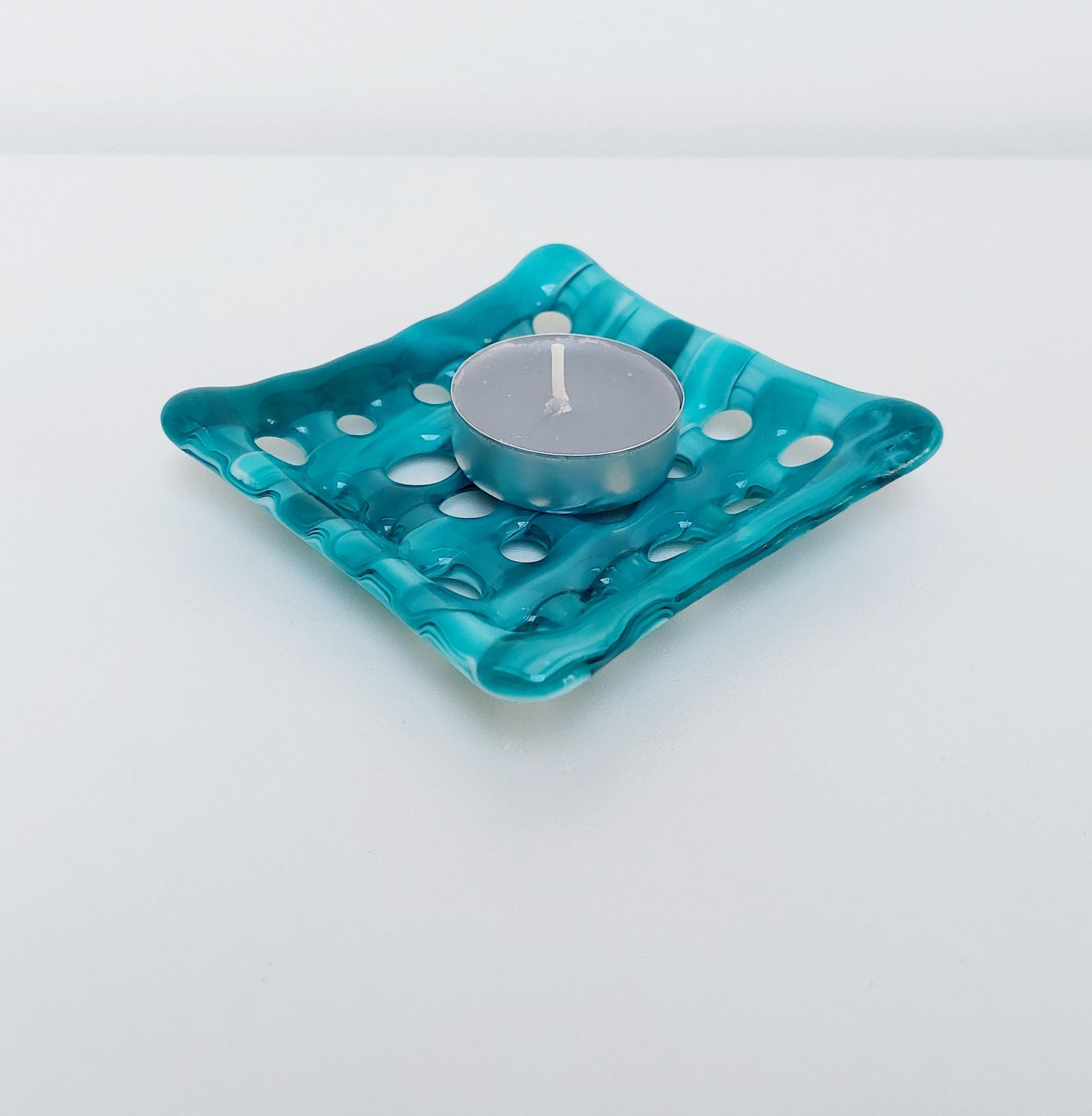 Teal and Aqua Glass Soap Dish with Holes