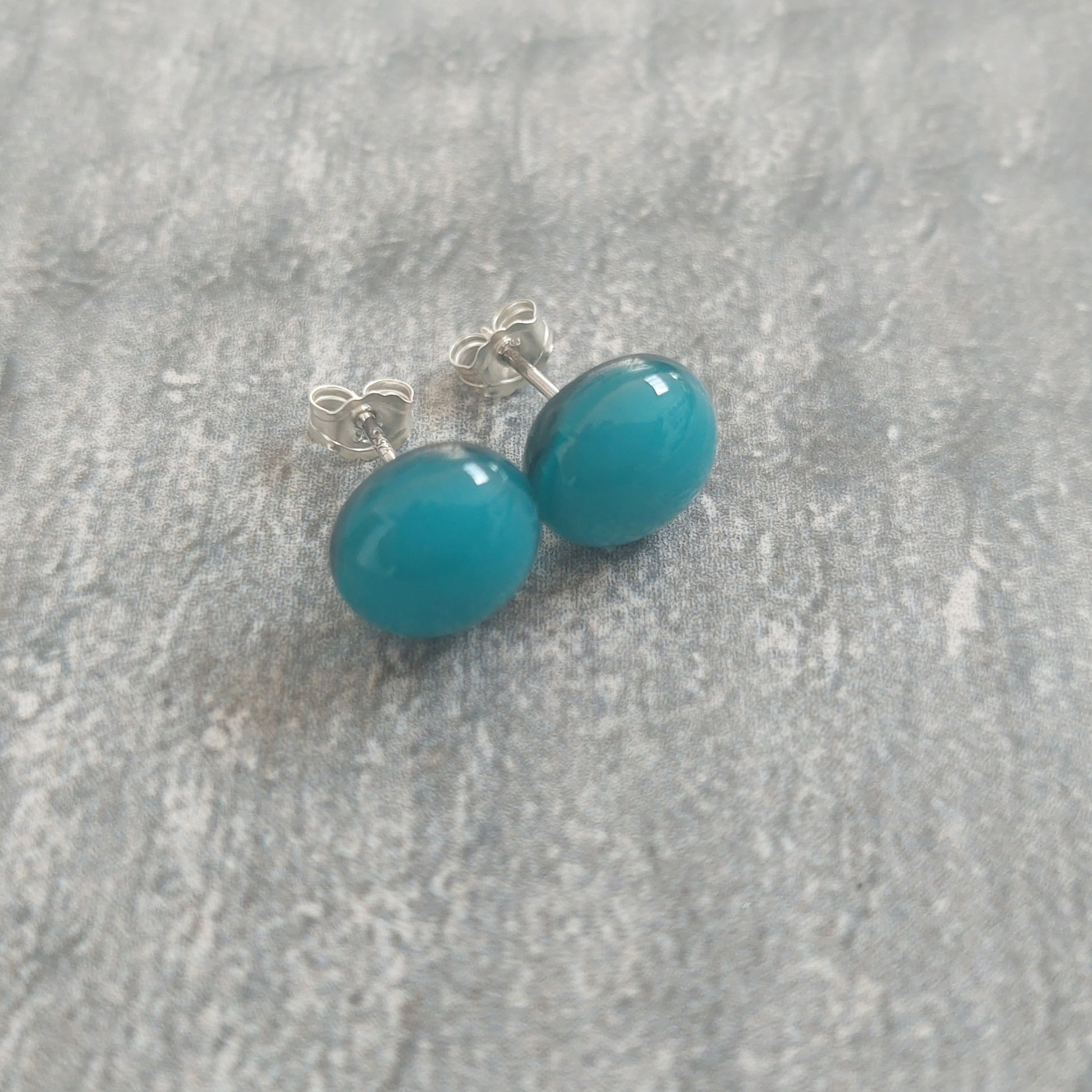 The studs were handmade from teal artisan glass (cut by hand) and fused in a kiln over a 24 hour period.