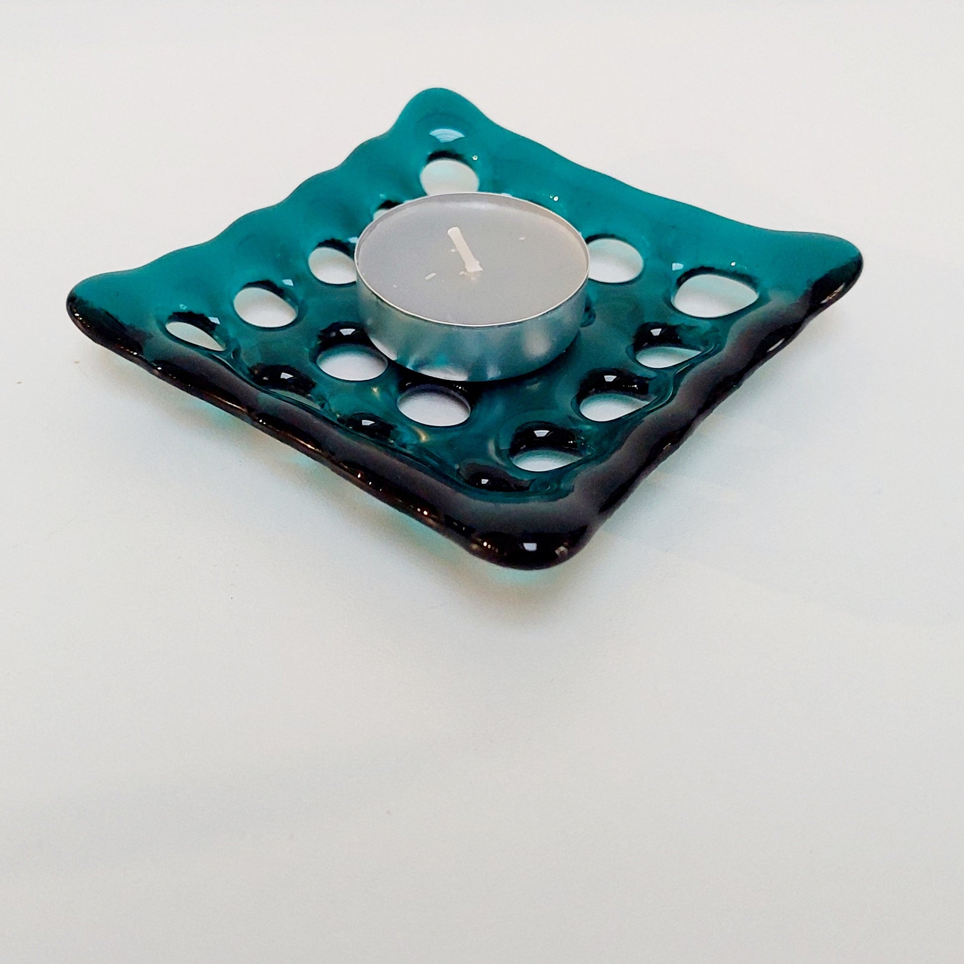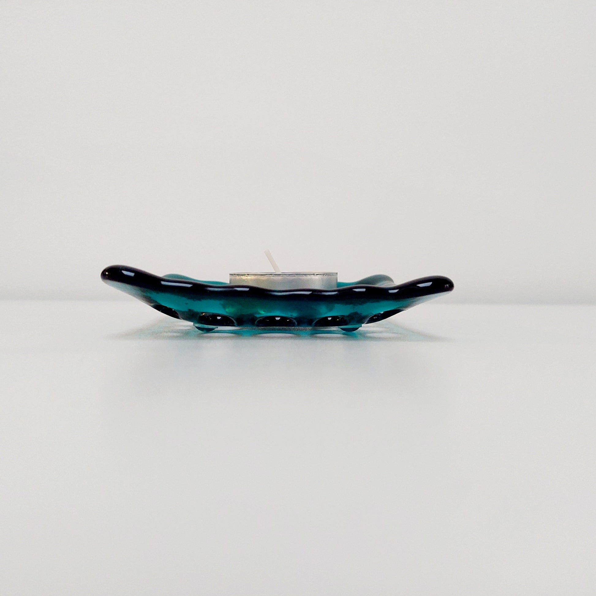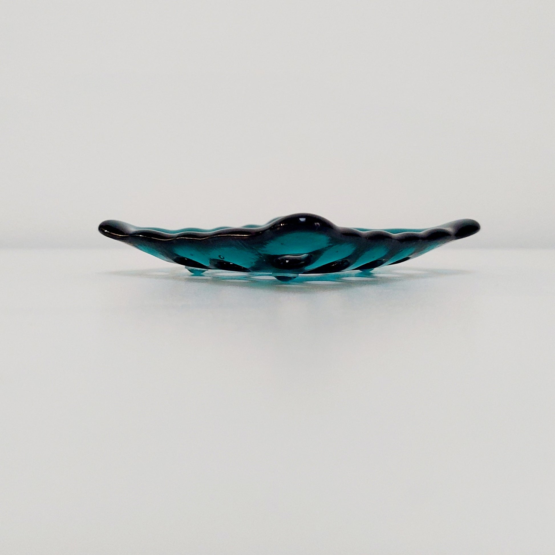 The dish was handmade from transparent teal artisan glass.