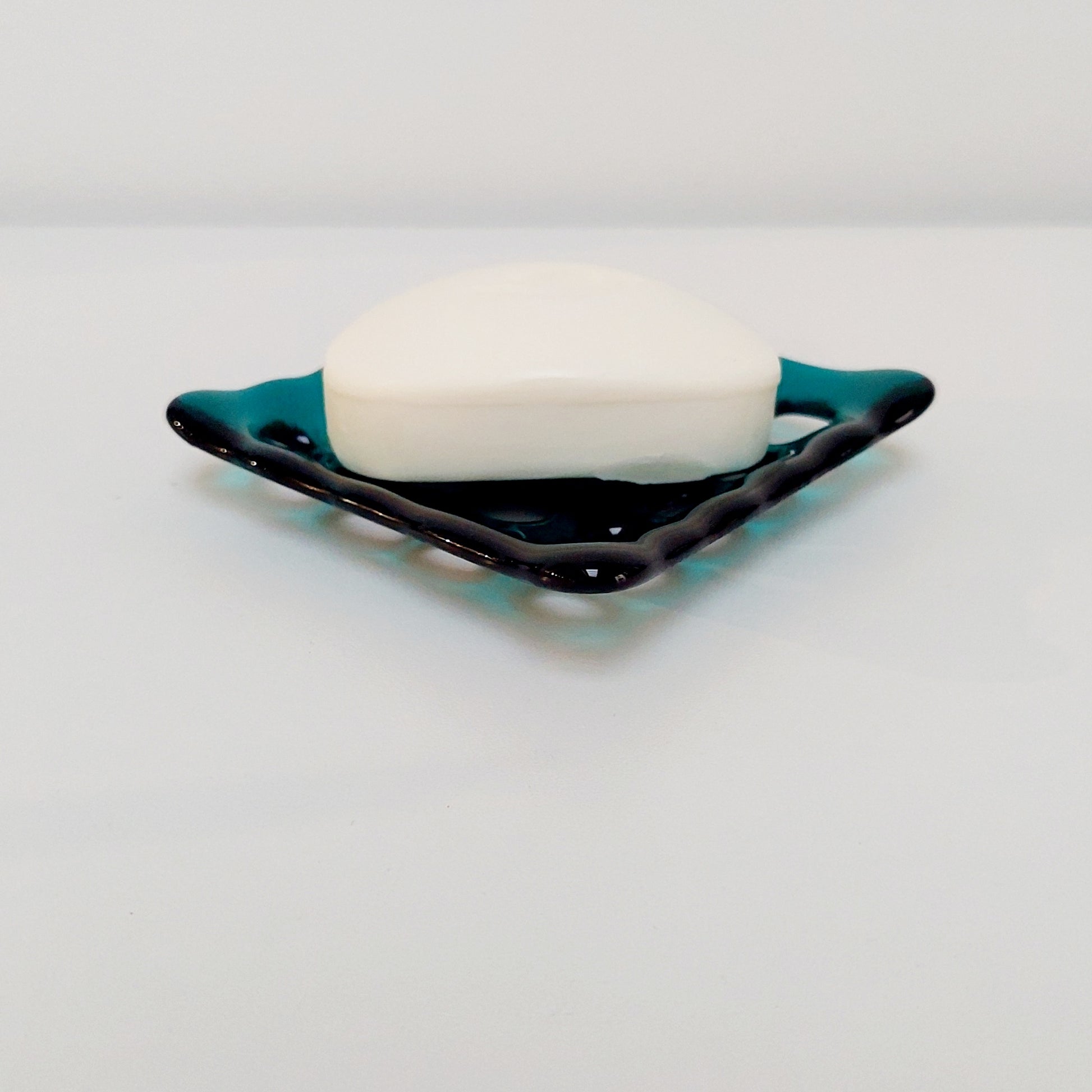 A teal glass soap dish handcrafted in the Lake District.