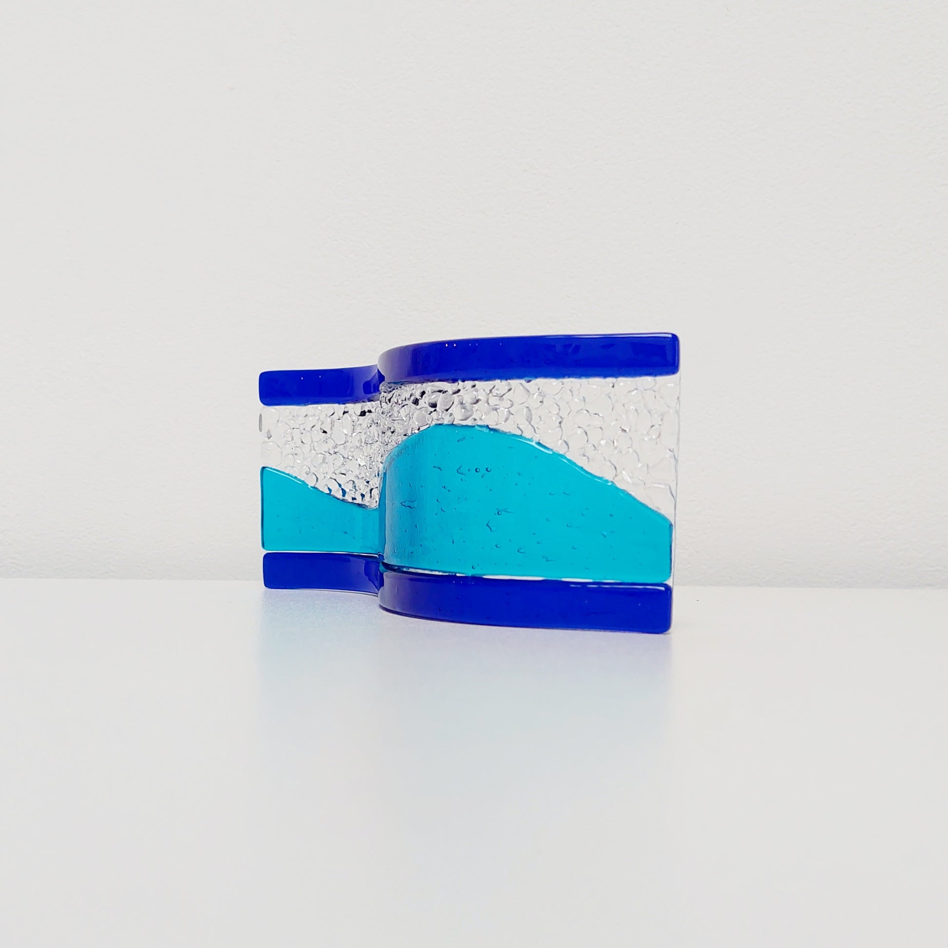 The freestanding wave was handmade from transparent turquoise, cobalt blue and crystal clear artisan glass.